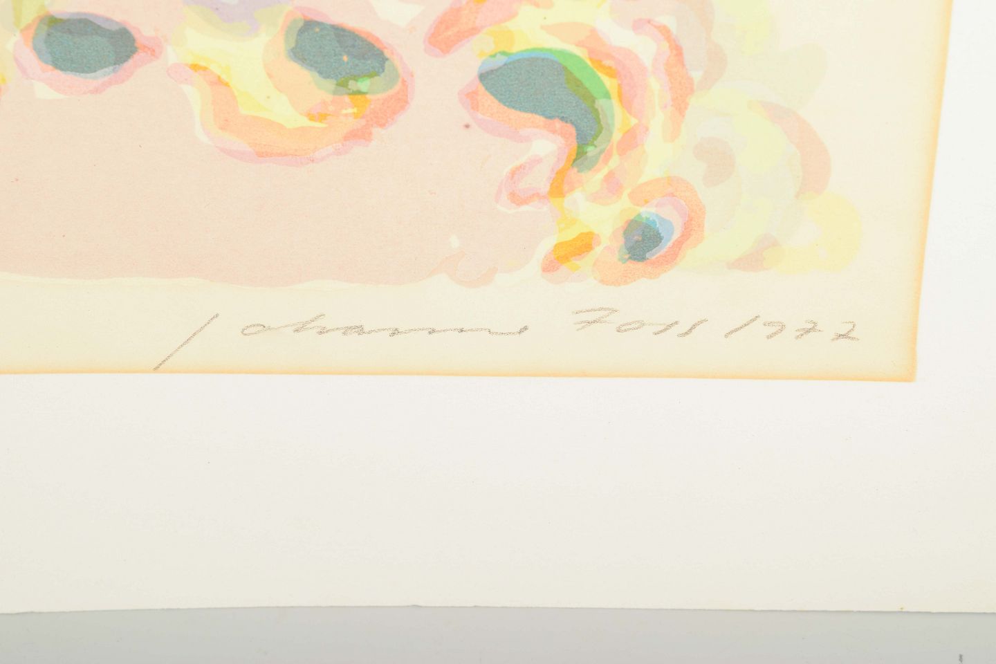 Signatur: Signeret “Johanne Foss 1977” nederst til højre, tituleret “Landskabet”.