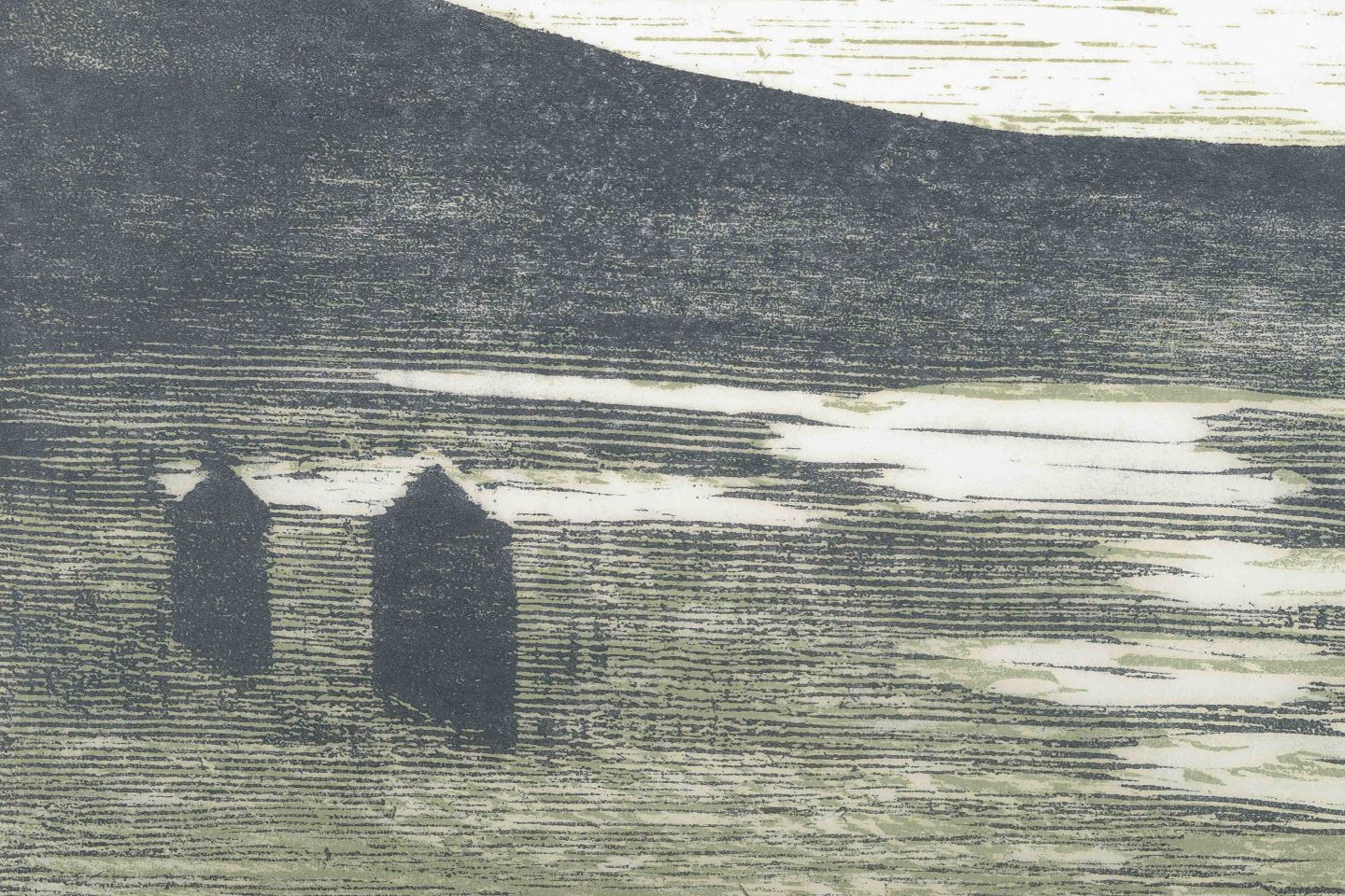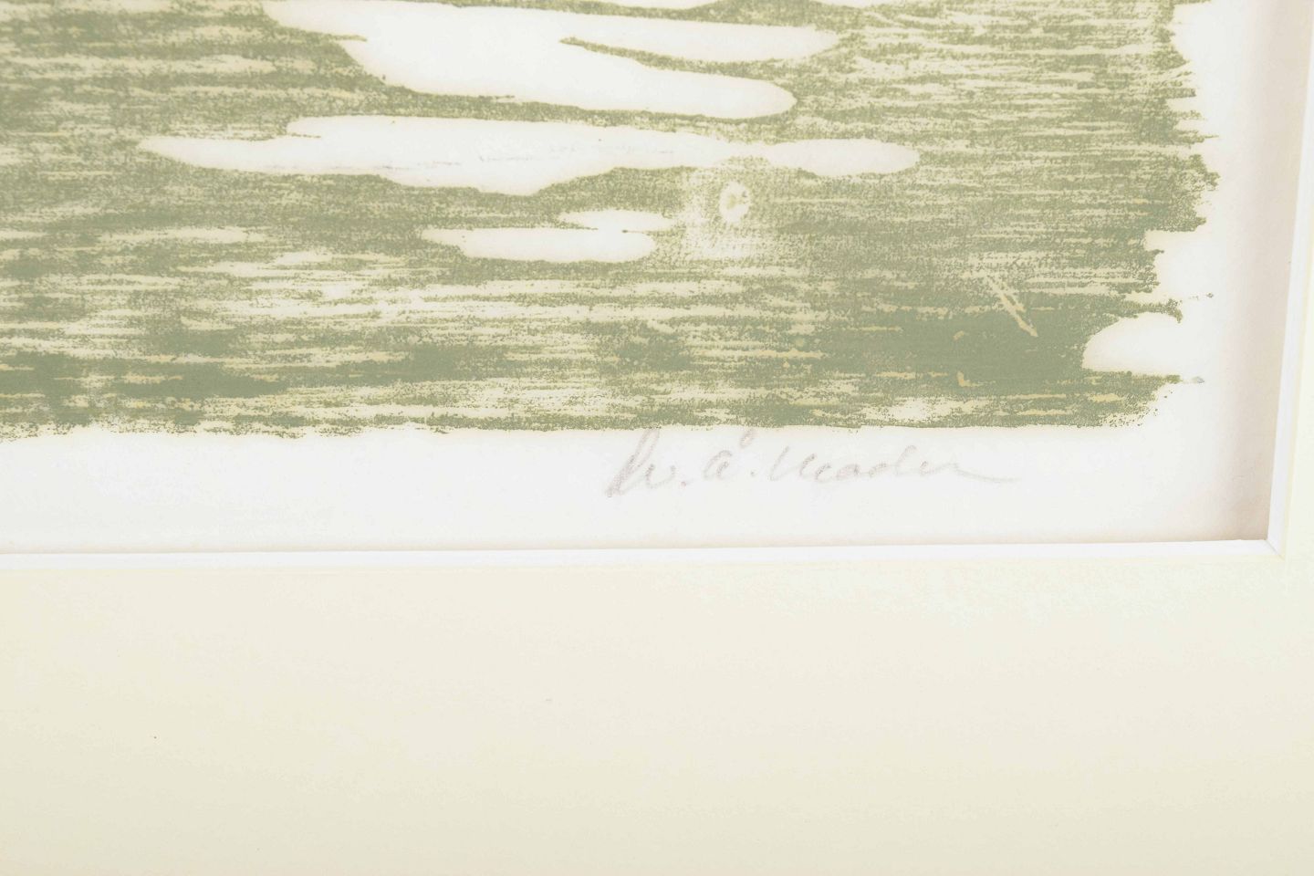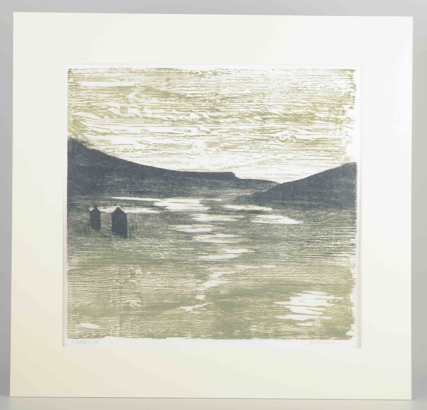 Et stemningsfuldt landskab, hvor lys og skygge spejler sig i vandets overflade og skaber en rolig og drømmende atmosfære. De bløde nuancer i grå og grøn toner understreger kunstnerens optagethed af lyset, tågen og de nordiske landskabers skiftende karakter.