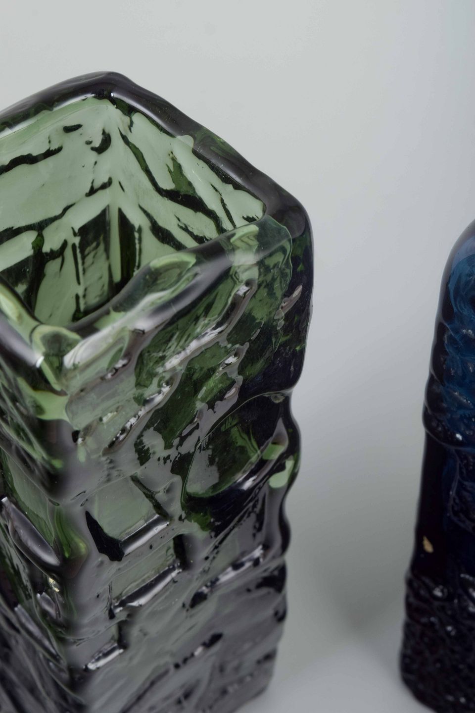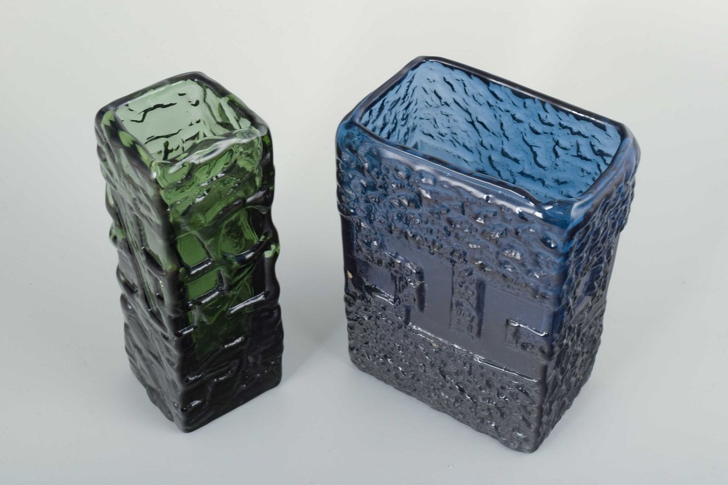 Rektangulær vase i blåt glas, dekoreret med dybt reliefmønster og en rustik overflade. Vasens kubiske form understreges af de geometriske detaljer i strukturen.