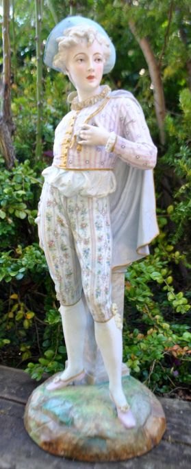 Stor bisquit figur af ung mand, 19. årh. Armand Marseilles, Tyskland. Koldbemalet porcelæn og med forgyldning. Stemplet. H: 55,5 cm.