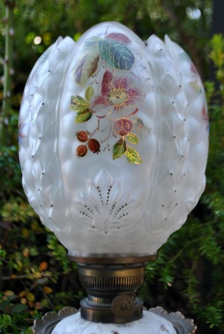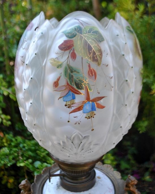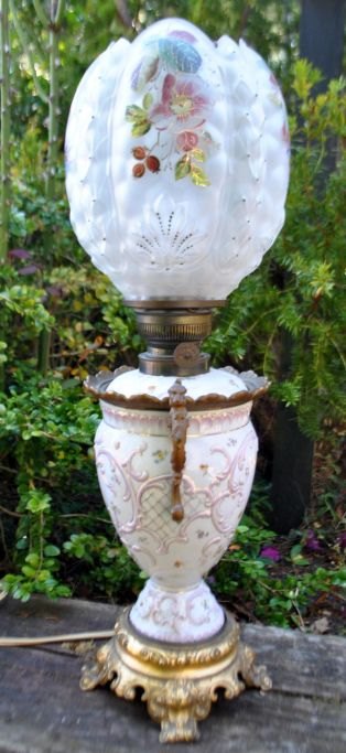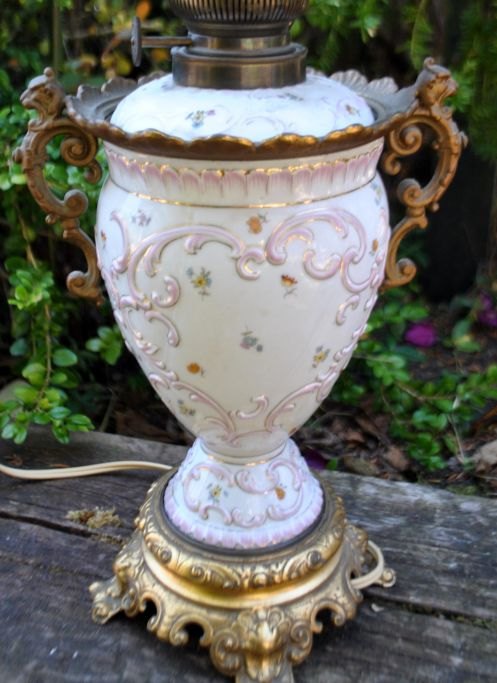 Petroleumslampe i porcelæn og glas, omgjort til el, 19. årh. Tyskland.