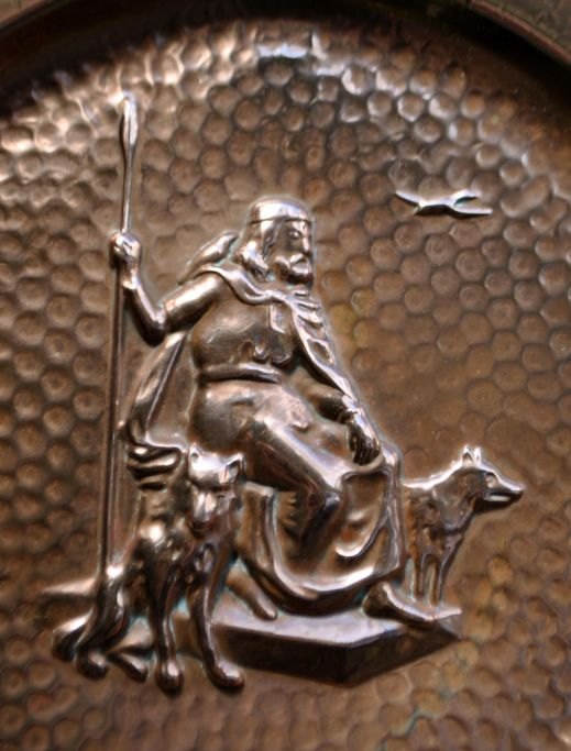 Kobberfad med Odin motiv, 19. årh, Danmark. Motiv af Odin med ravne og ulve. Vikingeornamentik på kant. Ustemplet. Dia: 42 cm.