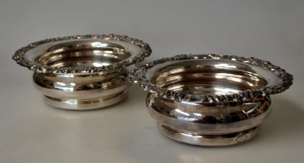 Par engelske vin bakker, forsølvet kobber, 20. årh. Med træbund. Kant med dekoration. H: 5,4 cm. Dia.: 15 cm.