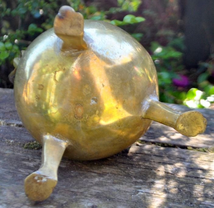 Barok trebens gryde med hank, 18. årh. Danmark. Ustemplet. Malm. H.: 15 cm. Højde med hank: 30 cm.