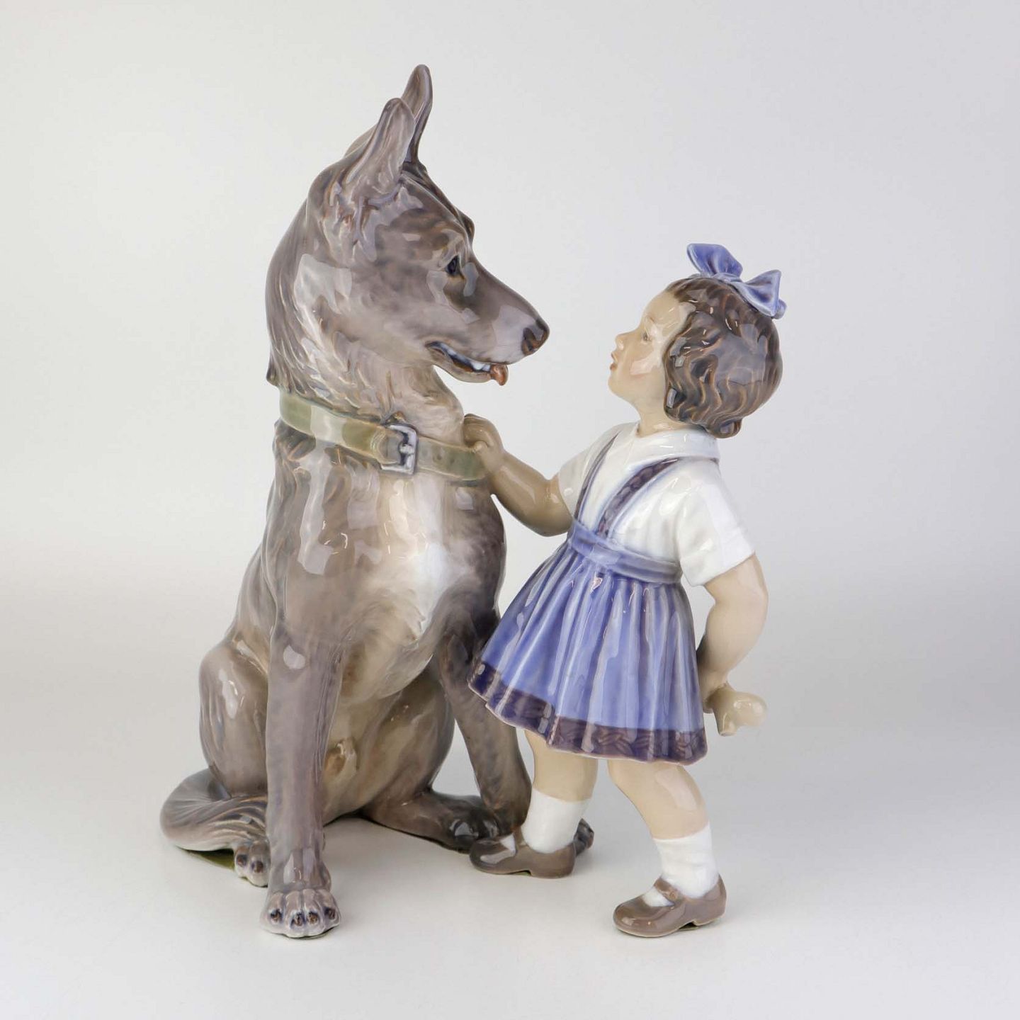 Figur i porcelæn med motiv af pige, som gemmer et købben bag ryggen med siddende schæferhund. Nr. 1213