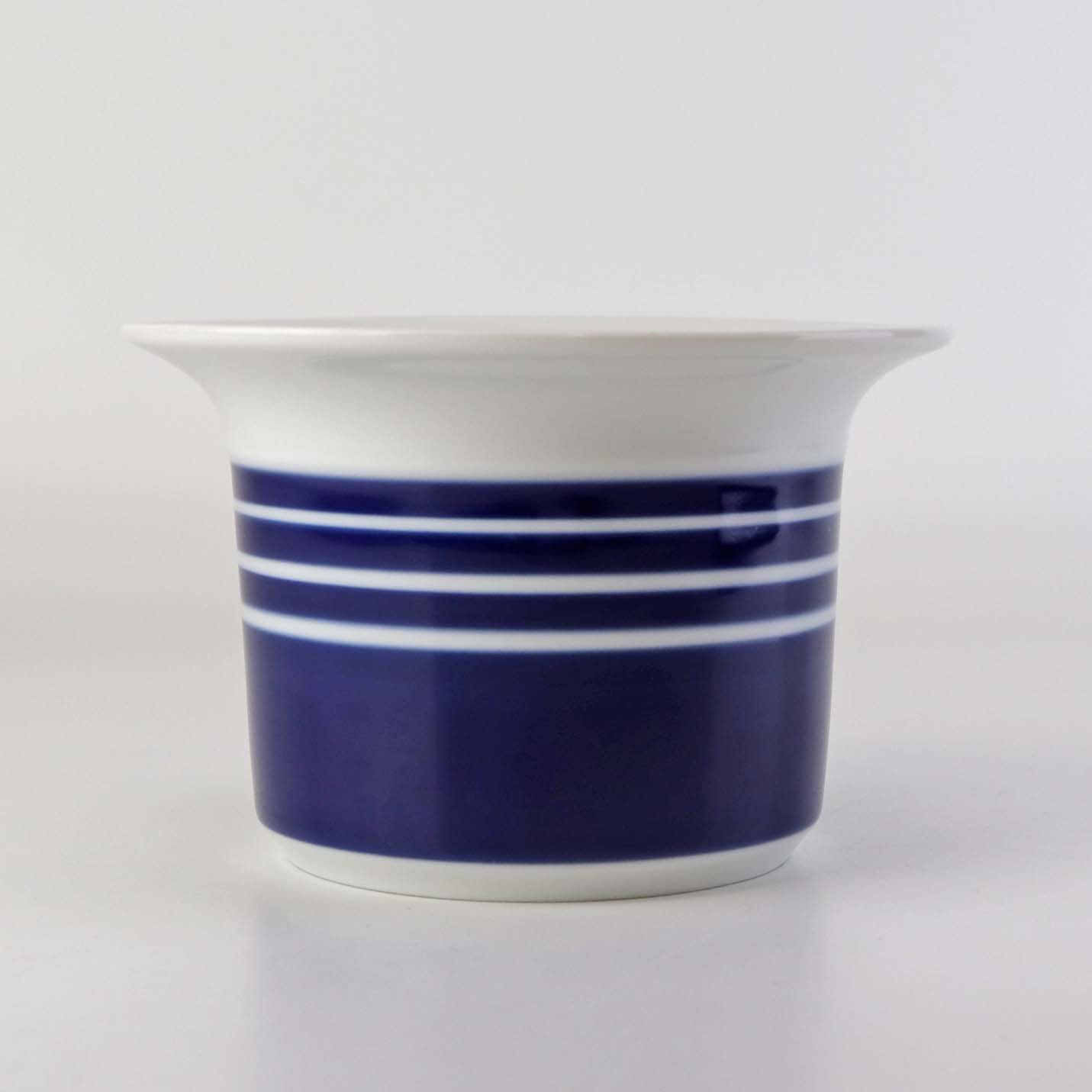 Urtepotteskjuler i glat hvidt porcelæn dekoreret med blå striber. Nr. 1855/6104