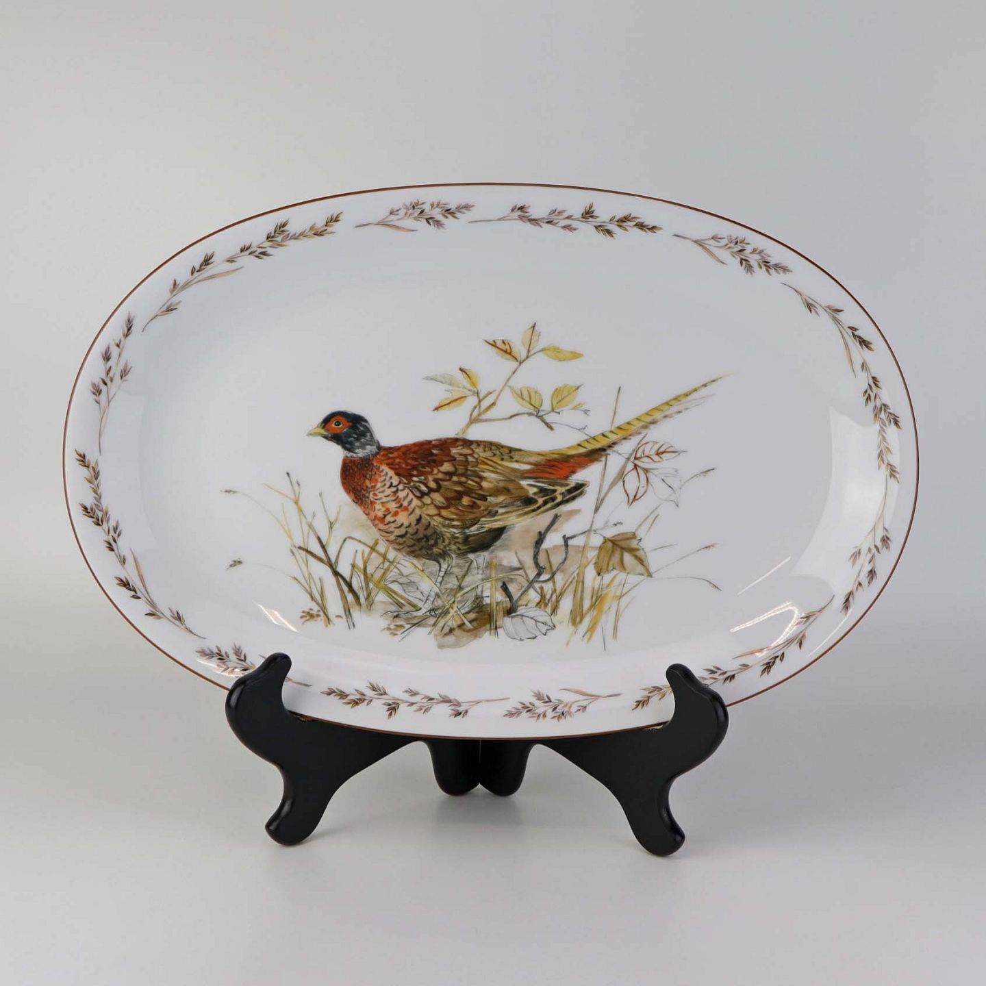 Ovalt serveringsfad i porcelæn med motiv af fasan fra stellet Jagtstel. Nr. 35