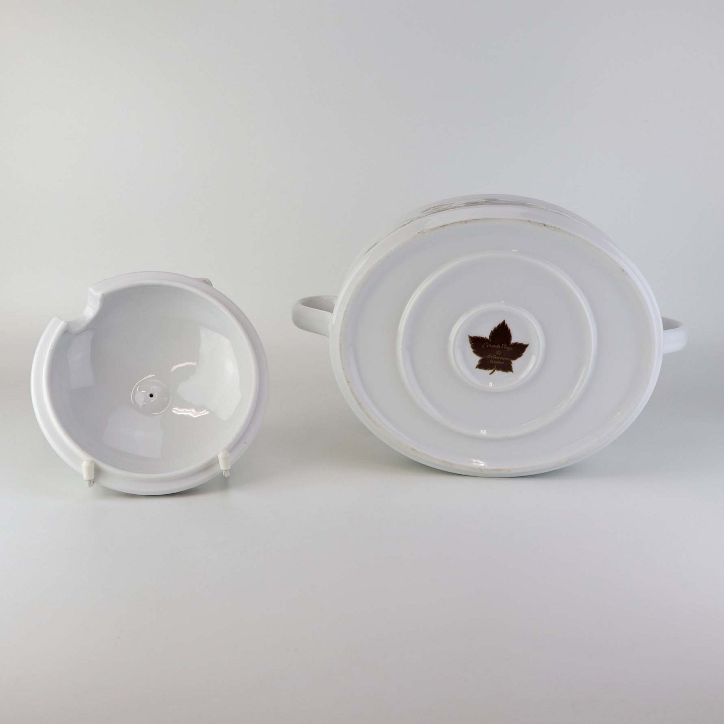 Ragout fad i porcelæn med låg og hanke, som er dekoreret med motiv af ænder fra stellet Jagtstel.