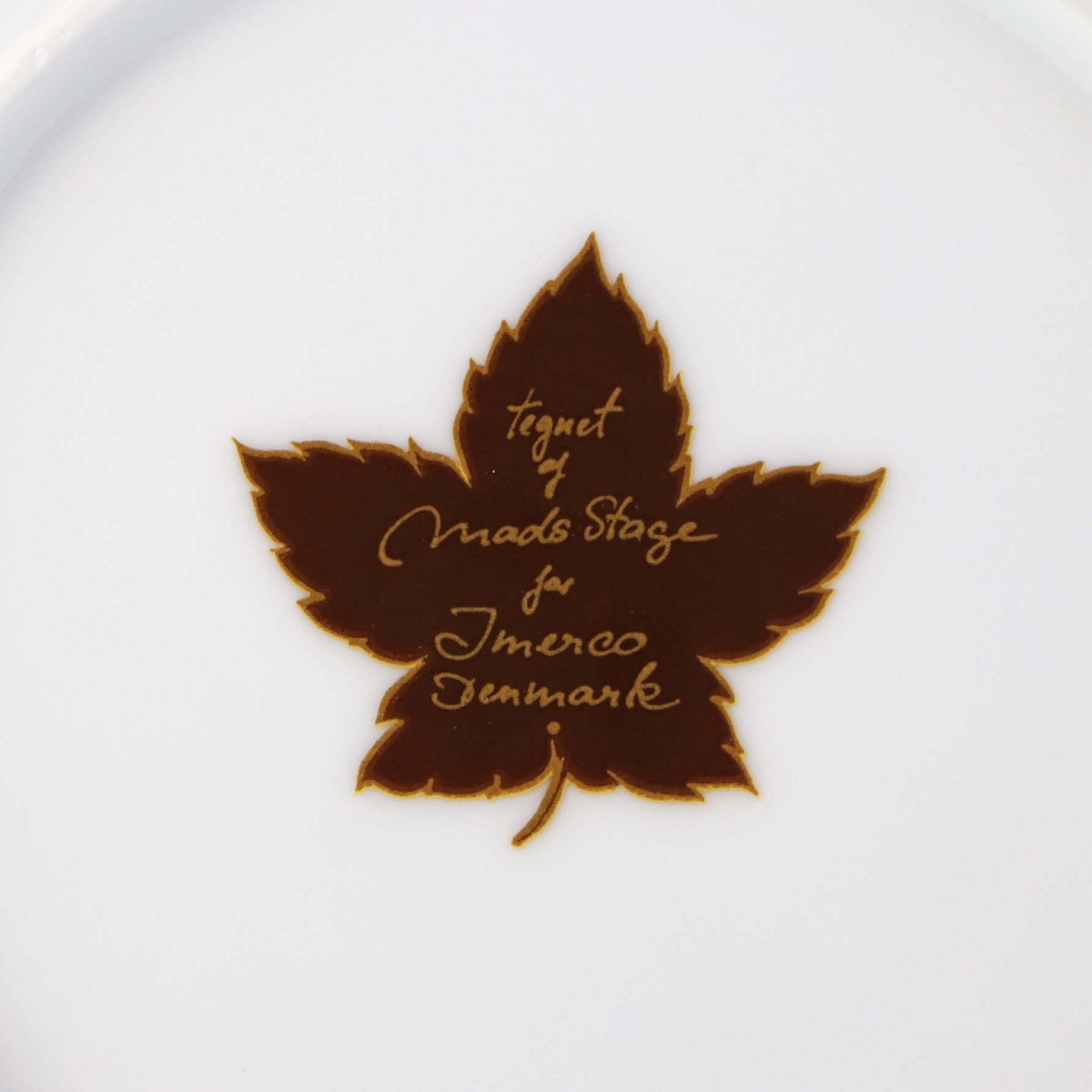 Jagtstellet er i glat hvidt porcelæn med gyldenbrun kantdekoration og motiver af forskellige vilde danske dyr i deres naturlige miljø. Stellet er holdt i dæmpede varme efterårsfarver.