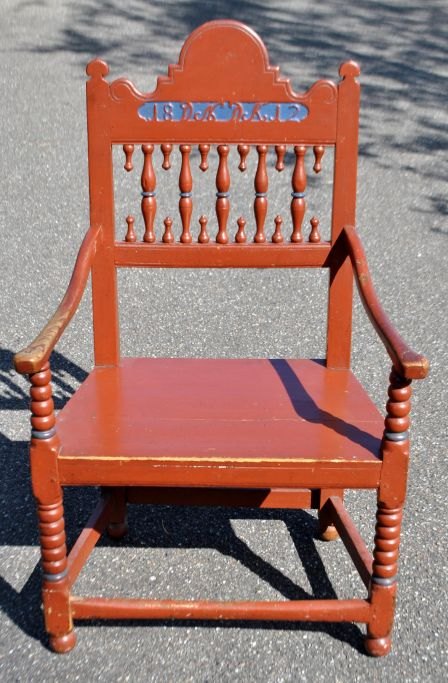Armstol af bemalet bøgetræ 1812. Danmark. Rødmalet. 5 delt tremmeryg. Ryggen skåret med karvsnit og initialerne: DN DK 1812. H.: 106 cm. B.: 67 cm. D.: 39,5 cm.