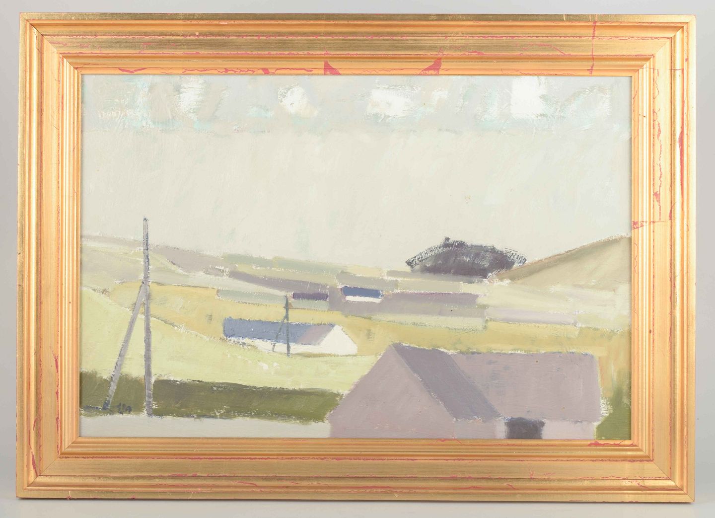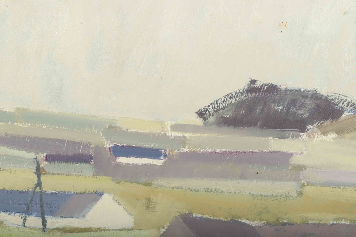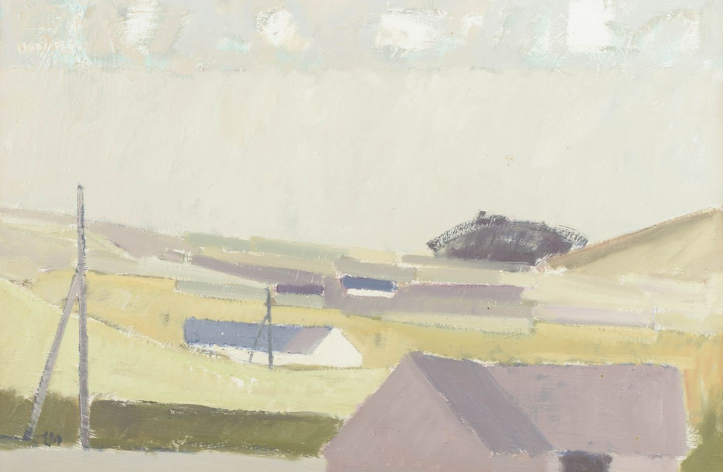 Et stemningsfuldt landskab med huse, udført i afdæmpede jordfarver og grønne nuancer, hvor arkitektur og natur smelter sammen i en rolig komposition.