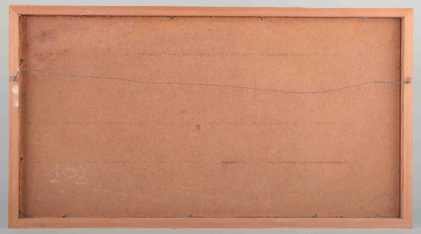 Et stemningsfuldt abstrakt stilleben, hvor geometriske og bløde former i blå, grønne og gule nuancer skaber en harmonisk og lyrisk komposition. Motivet antyder et interiør med blomster og genstande, fortolket i en løs og ekspressiv penselføring typisk for perioden.