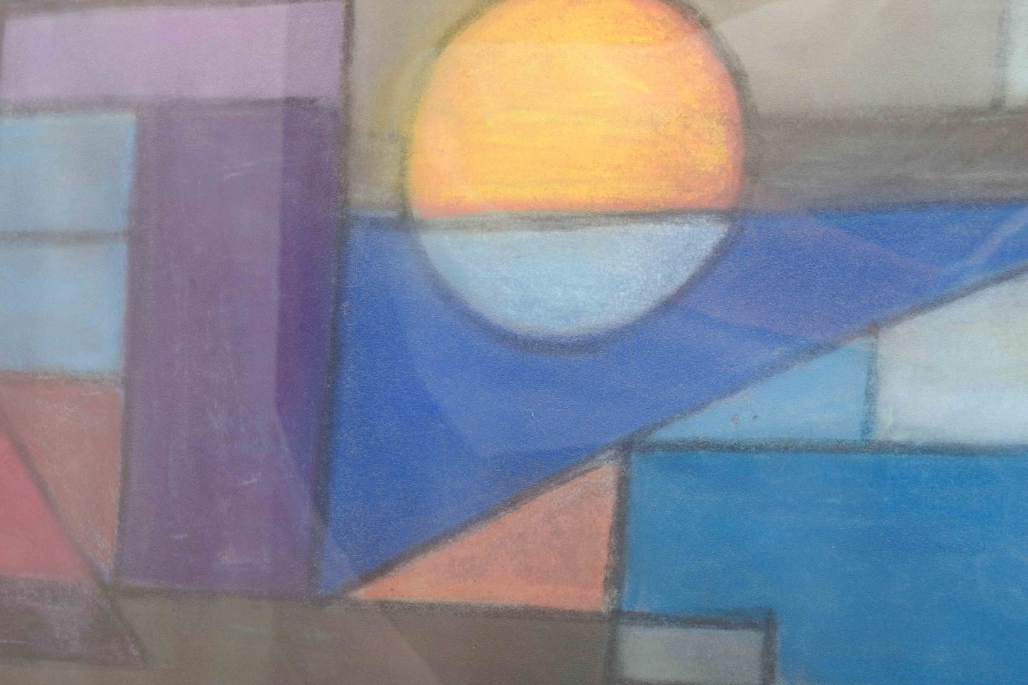Et geometrisk-abstrakt værk udført i farvekridt, hvor klare felter i blå, rød, lilla og brun mødes i en stram, konkret komposition. Sol- eller måneformen i venstre side giver en kontrast til de kantede former og tilfører værket en poetisk balance mellem det organiske og det konstruktive. Typisk for den konkrete kunst fra 1960’erne og 70’erne, hvor farvernes renhed og formernes præcision står i centrum.
