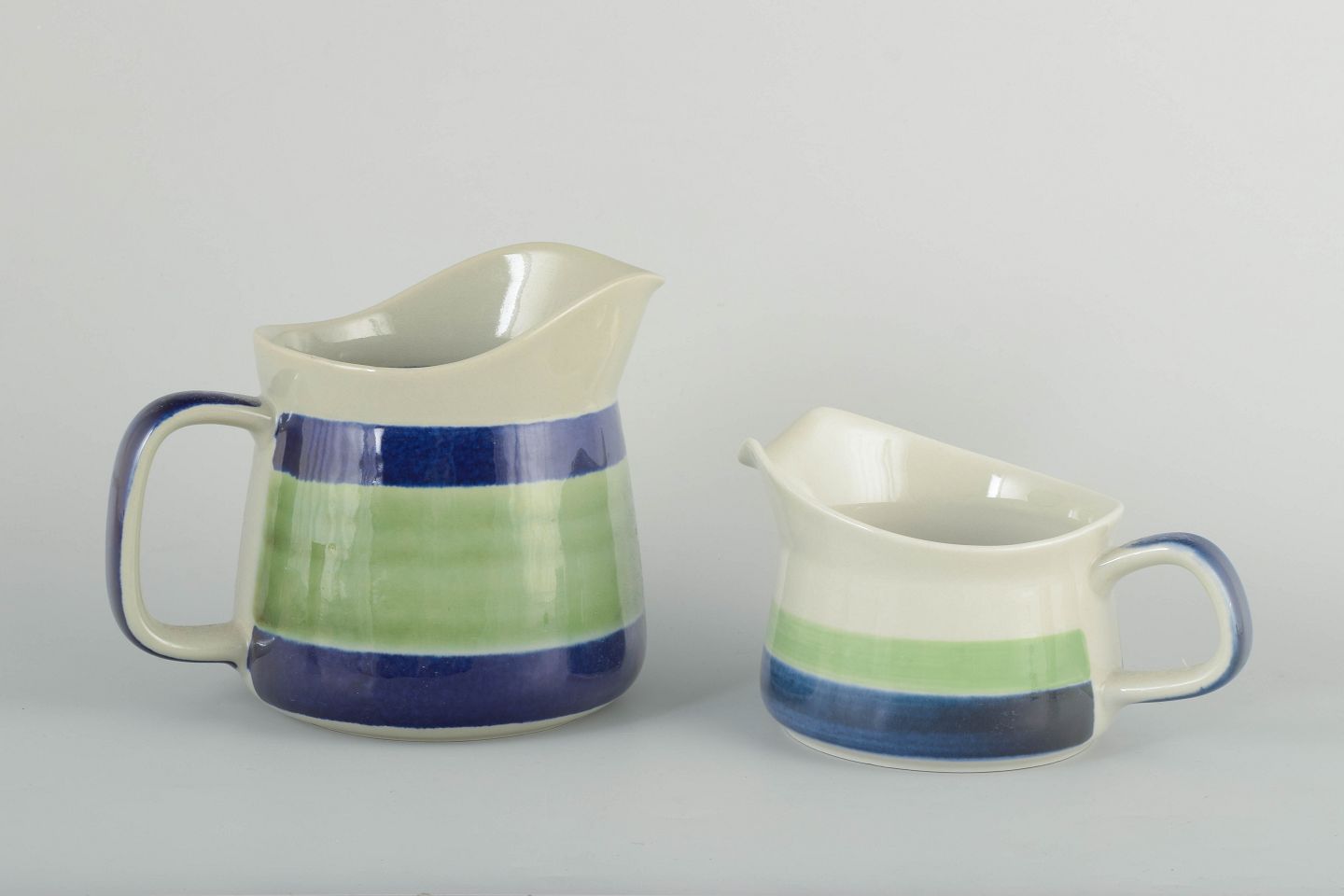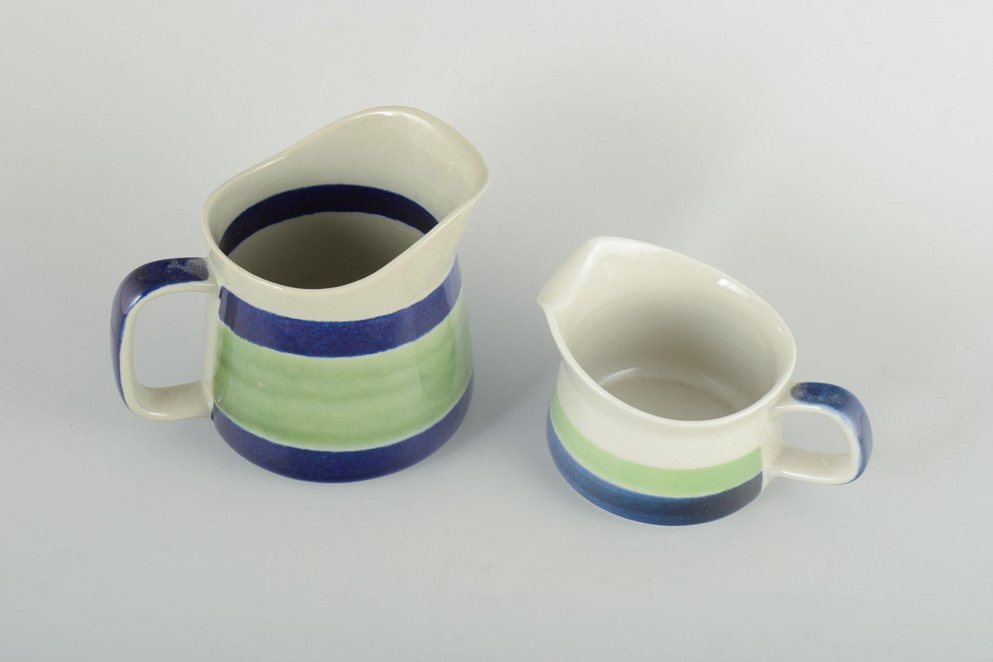 To kander i fajance med hvid glasur, grøn og blå dekoration.