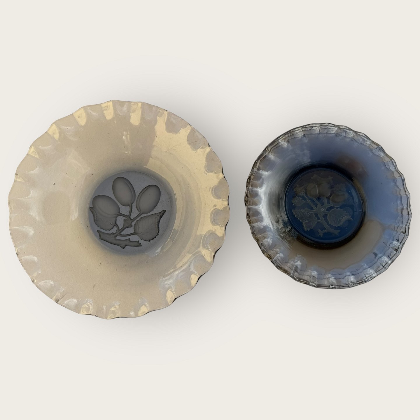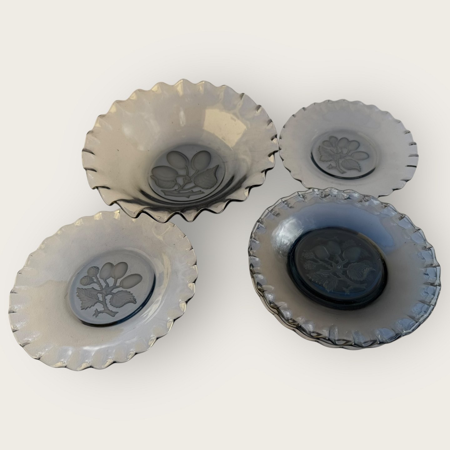 | Glasskål og 6 desserttallerkner med blomster / frugt motiv, flæsekant udført i gråtonet glas, skål diameter 21cm, højde 5,5cm, assietter diameter 16,5cm, *fin stand*
