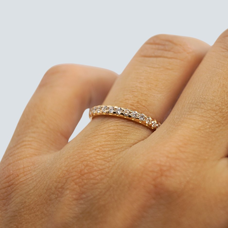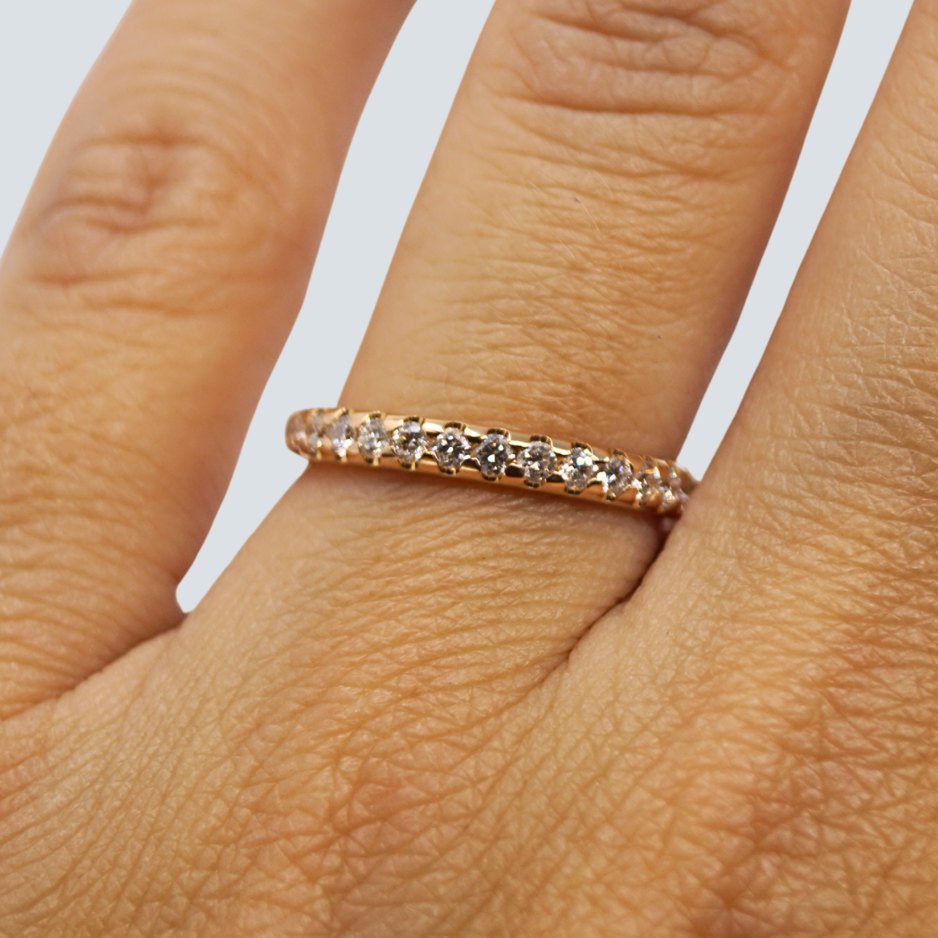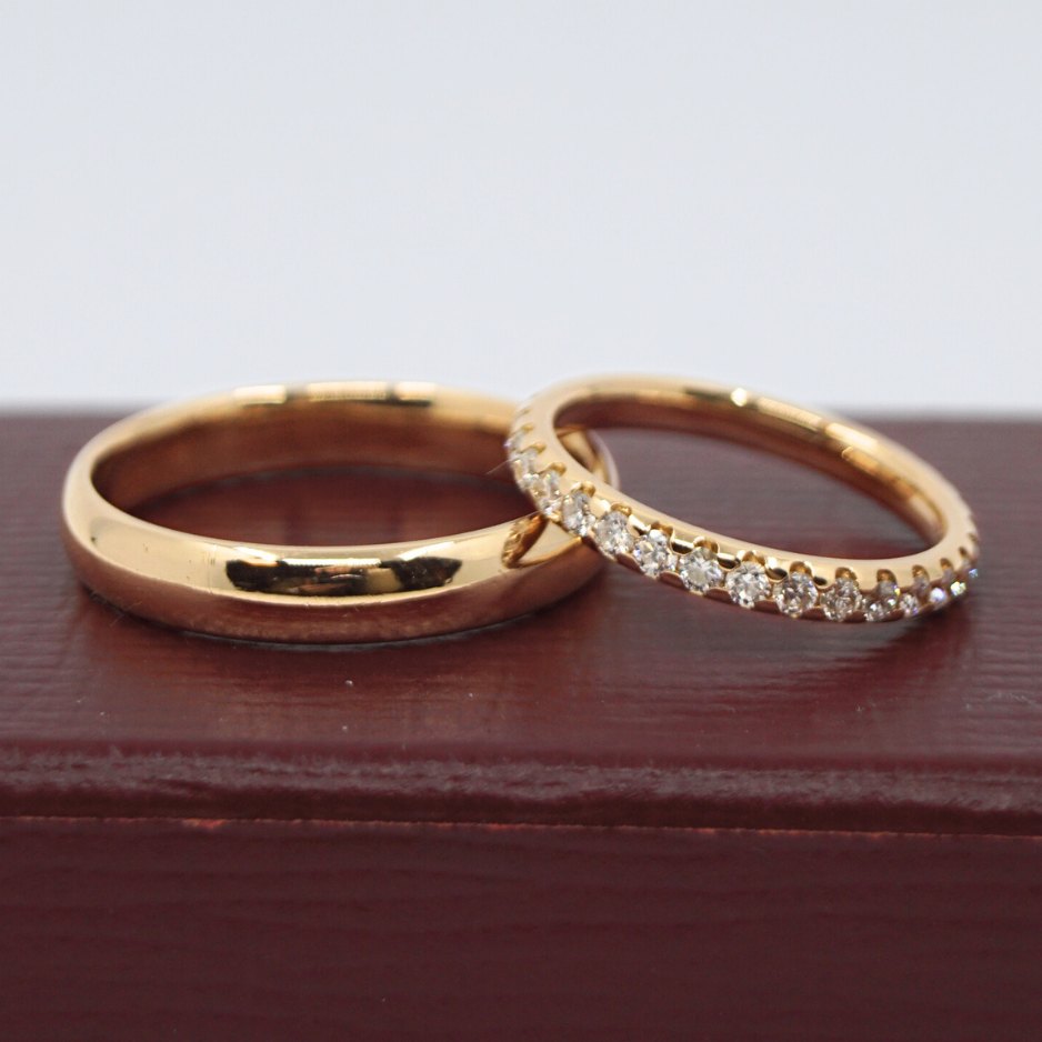 Sæt vielsesringe i 18 kt. guld. Den ene med blank overflade, i ring str. 61 (størrelse kan evt. omforandres). Den anden prydet med diamanter, i alt 0.70ct. TW Si. I ring str. 50.