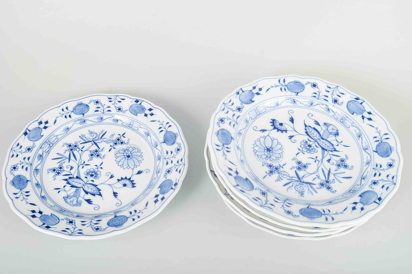 Sæt af seks “Blue Onion” middagstallerkener i porcelæn, håndmalet i den klassiske blå løg-dekoration (Zwiebelmuster). Annulleret med to indridsede streger under bunden. Perfekt stand.