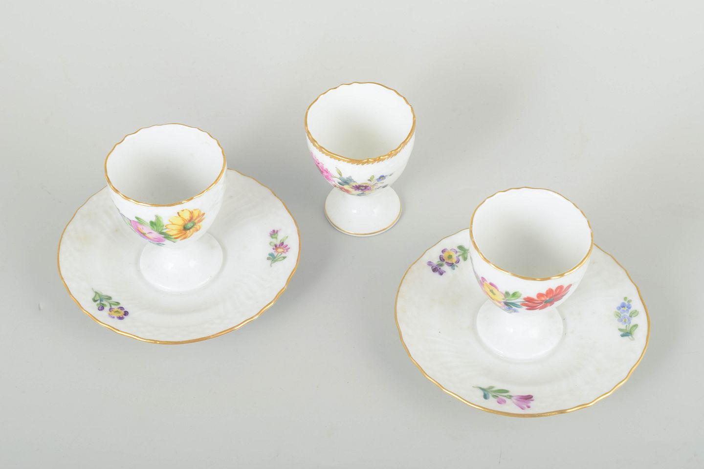 Tre æggebægre i porcelæn, heraf to på fastmonterede underkopper, dekoreret med håndmalede blomster i det klassiske “Sachsisk Blomst” mønster og guldkant.