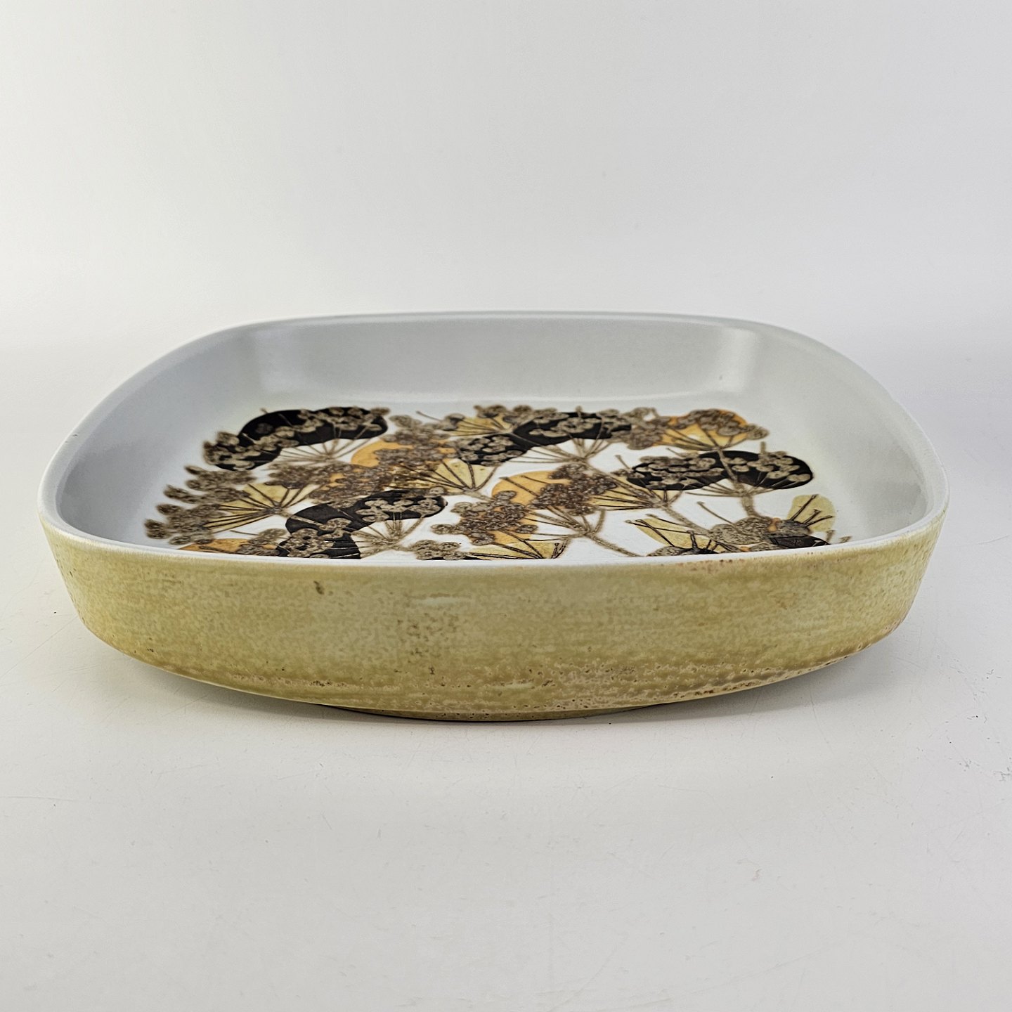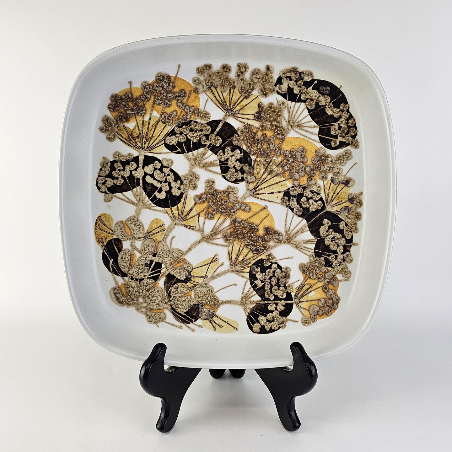 Firkantet fad i hvid fajance fra serien Baca med abstrakt blomstermotiv i brune, sorte og gyldne nuancer