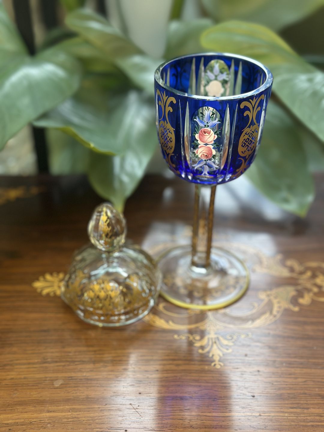 Bohemia krystalbæger med låg på lavet i overfangsglas , håndslebet blykrystal , emalje og guld , fra rokoko tide, fremstilling 1950-1970