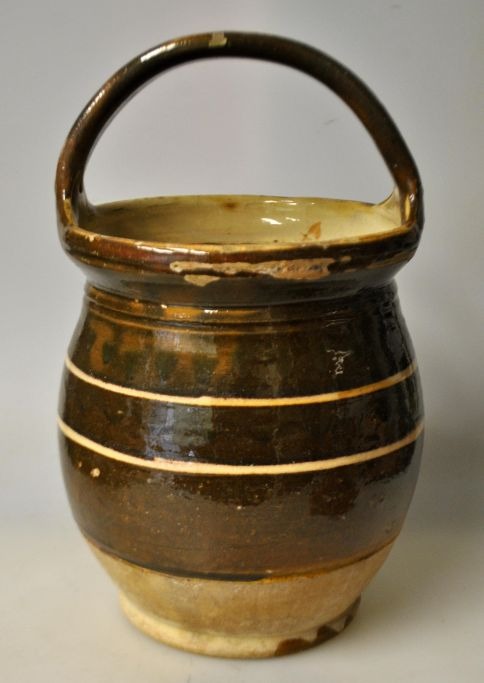 Dansk antik barselspotte i rødler, 19. årh. Brunglaseret med hvide striber. H.: 26 cm.