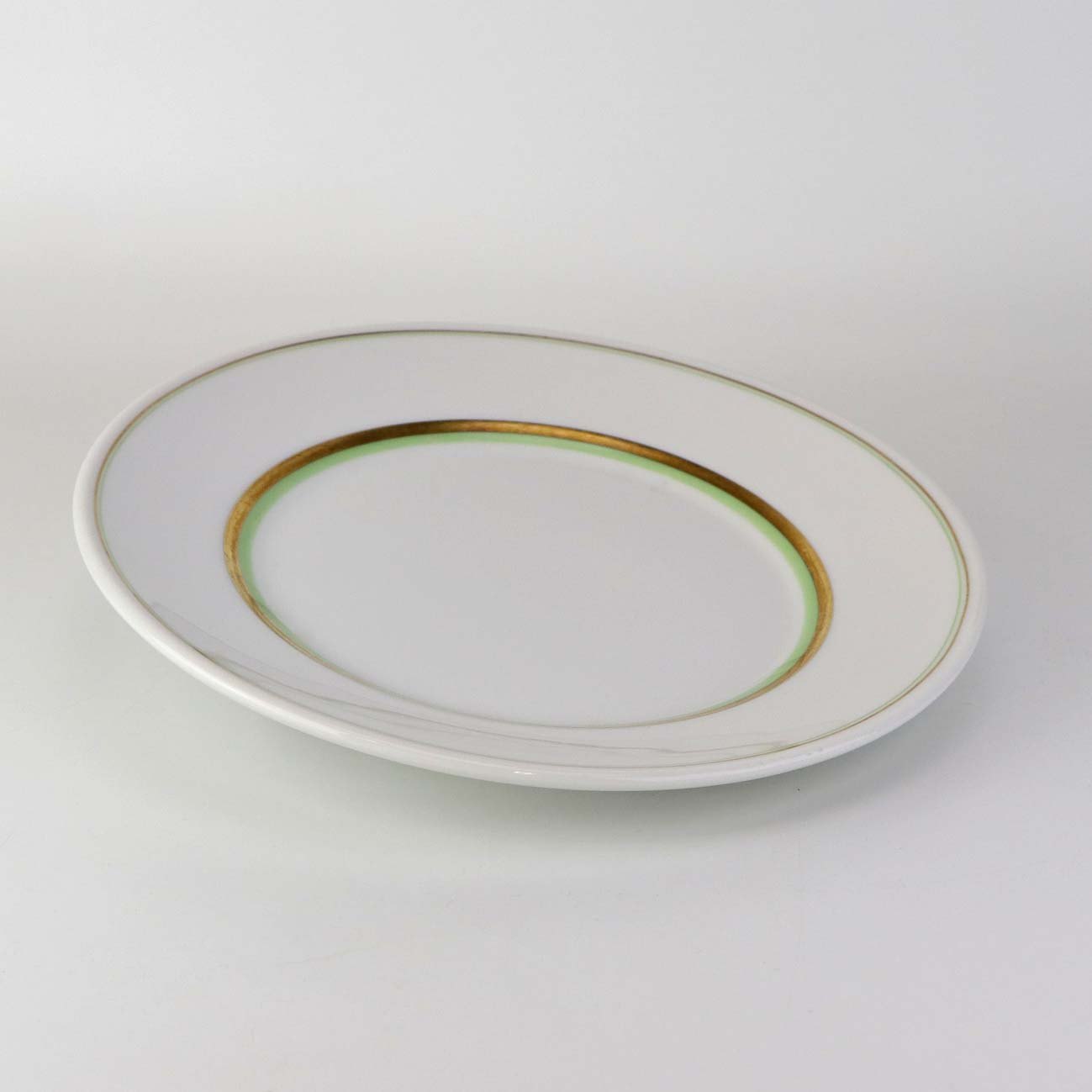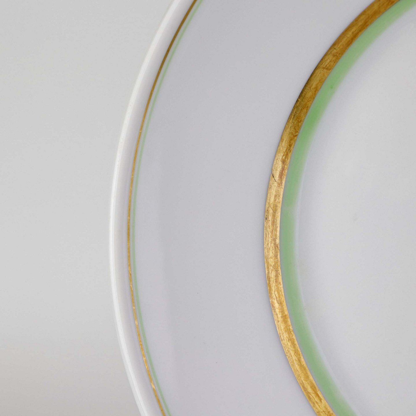 Service i glat hvidt porcelæn med dekoration i grøn og gylden streg.