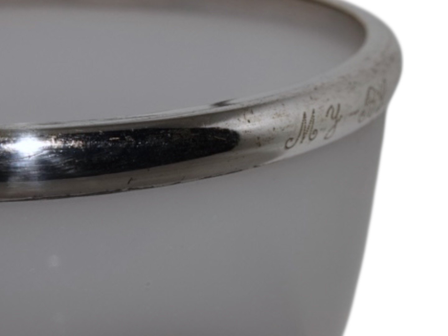 Kandisskål (sukkerskål) i hvidt opalineglas med hank i sølvplet hank fra 1800 tallet.