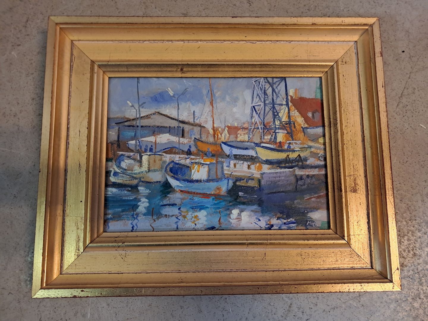 Maleri af Dragør Havn i guldmalet ramme, af : Mogens Amdi Thorsen (1924-2016)
