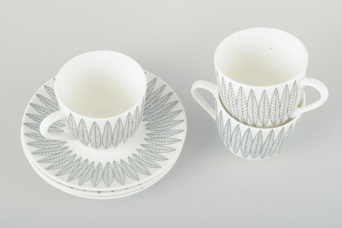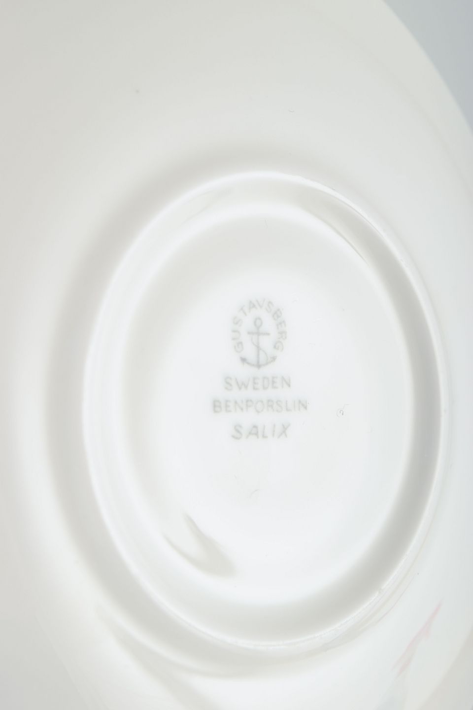 Fajance med det karakteristiske “Salix”-mønster i grå på hvid bund, designet af Stig Lindberg.