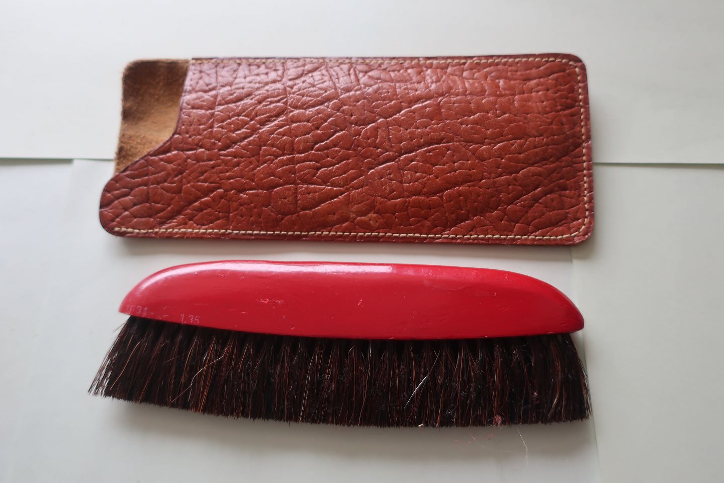 Klædebørste/fnugbørste i træ med etui i skind Lige til at have i tasken eller bilen