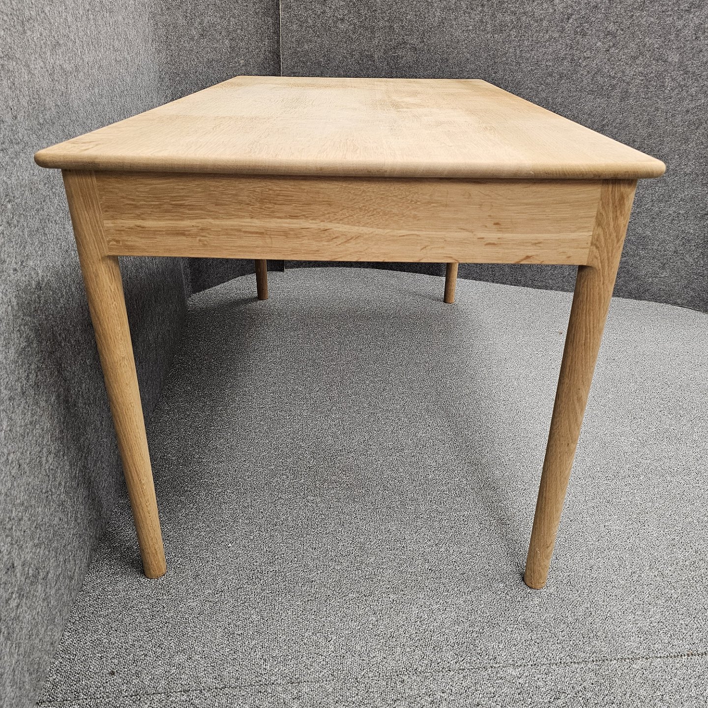 Fritstående skrivebord i egetræ med tre skuffer, højre skuffe har lås og medfølgende nøgle