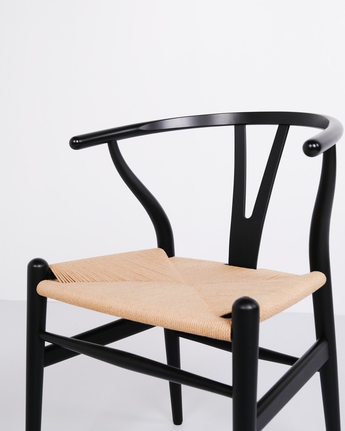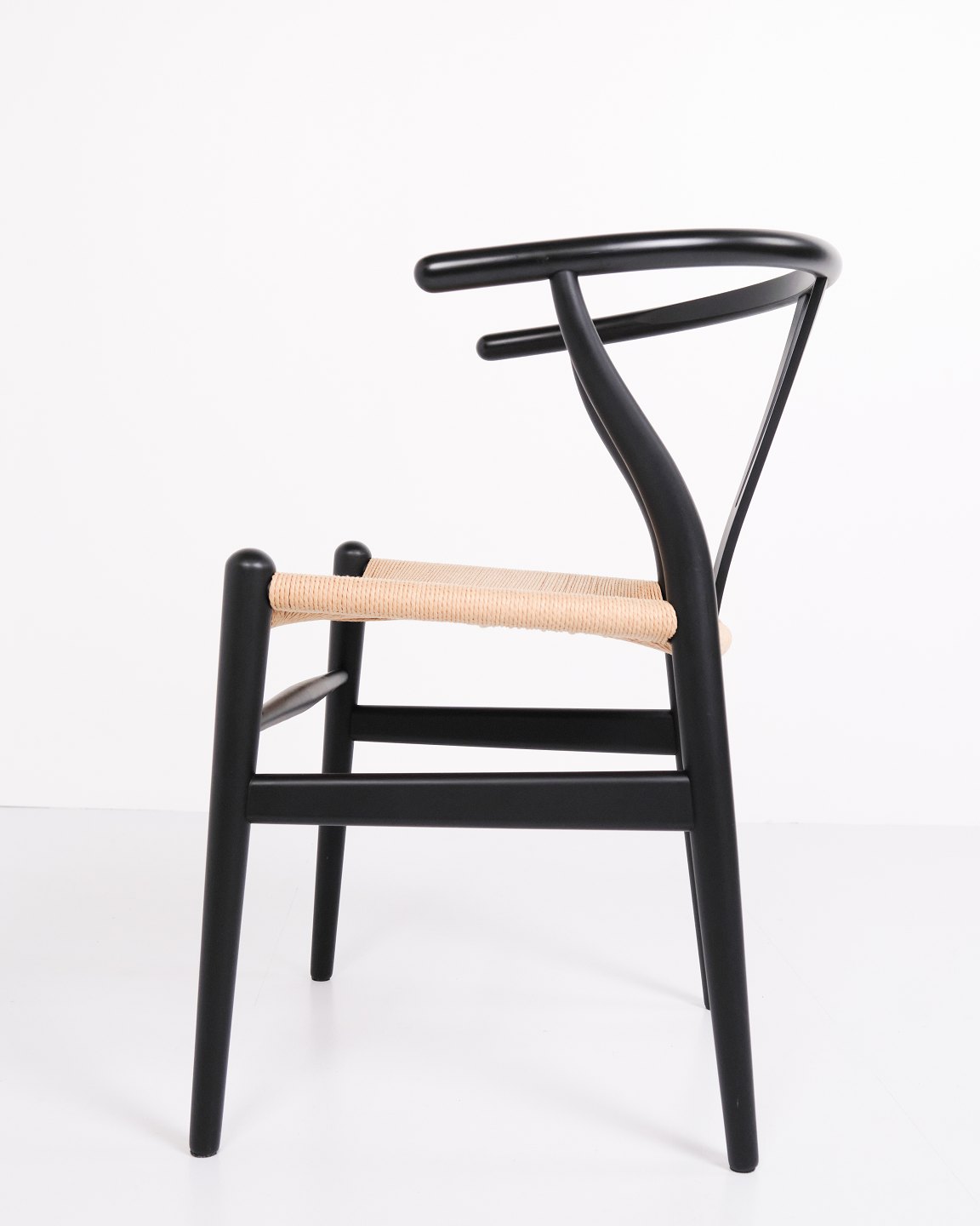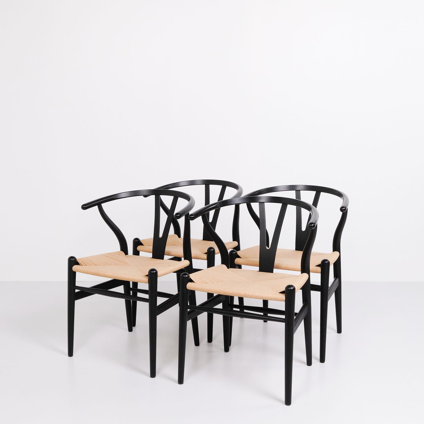 Sæt af fire Y-stole, model CH24, designet af Hans J. Wegner og produceret af Carl Hansen & Søn. Stolene er udført i massivt træ, lakeret i Soft Black, og med sæde i flettet naturpapir.