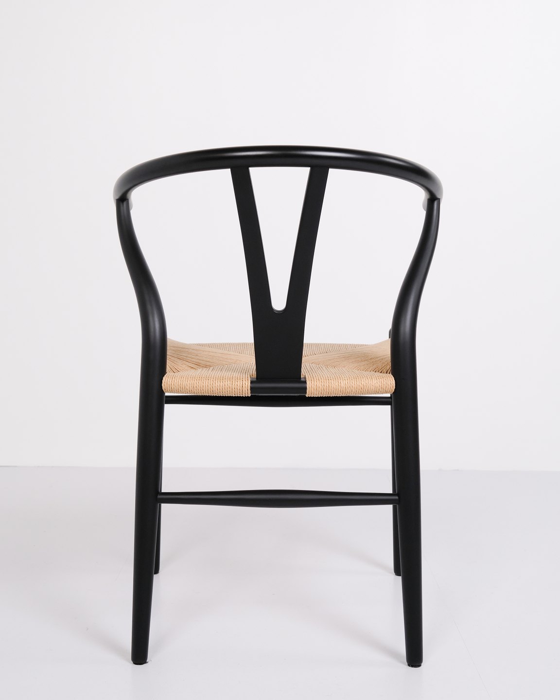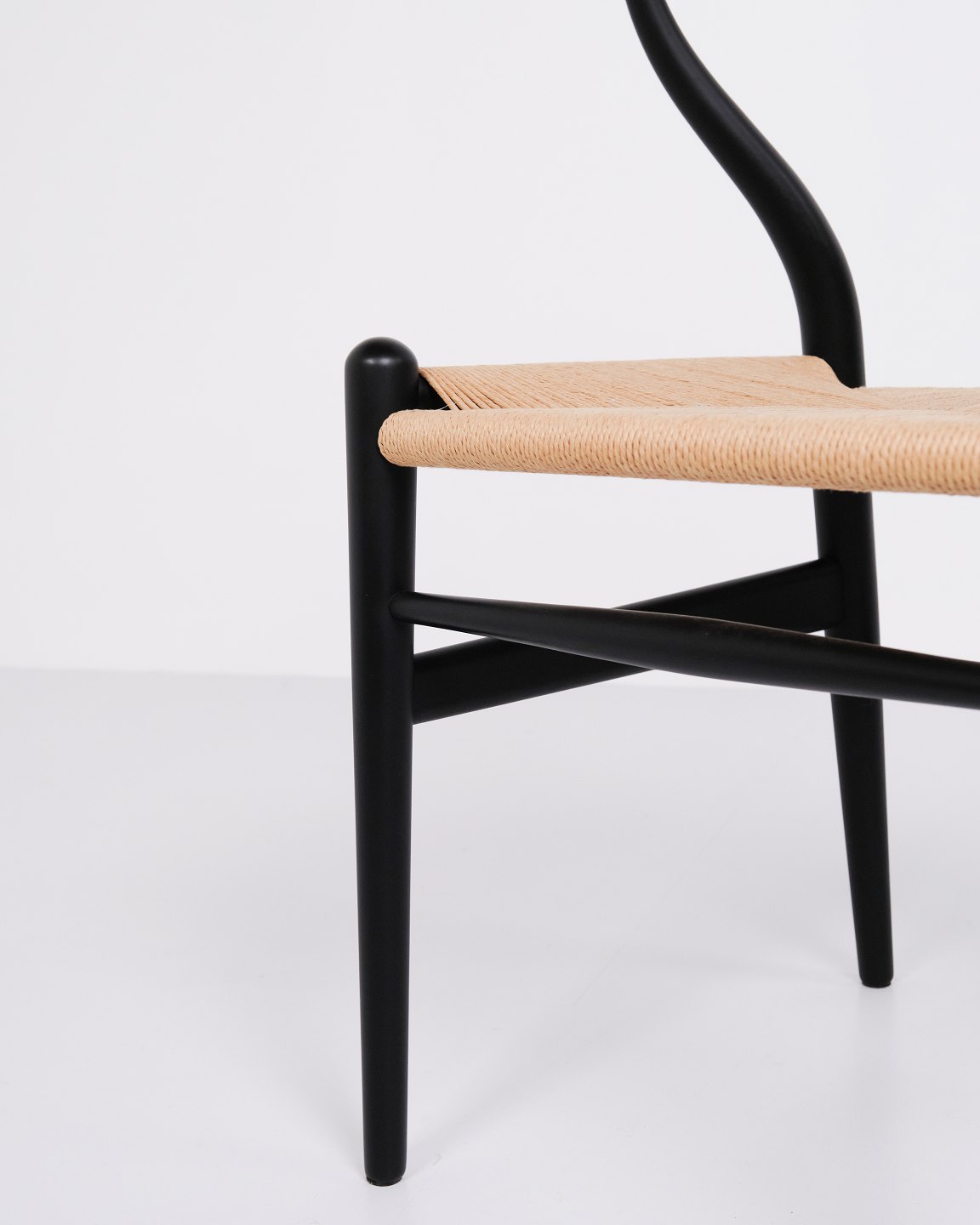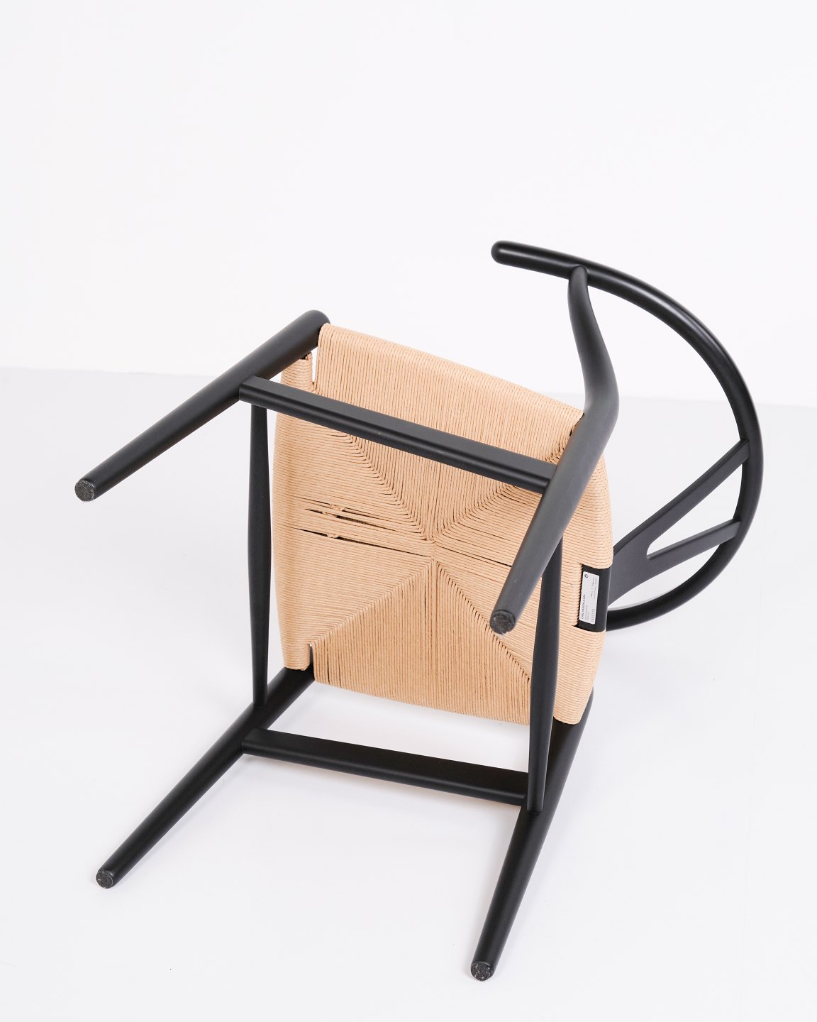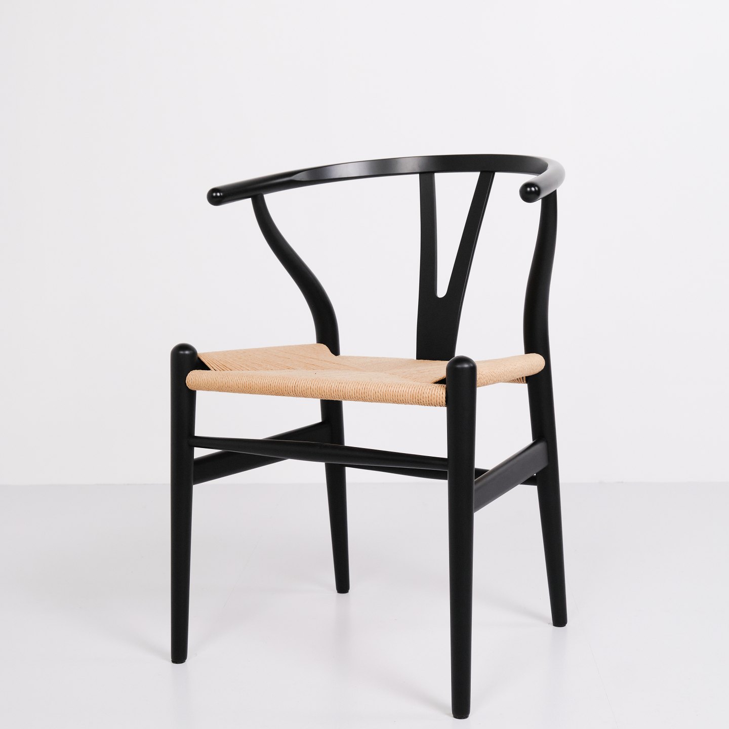 Sæt af fire Y-stole, model CH24, designet af Hans J. Wegner og produceret af Carl Hansen & Søn. Stolene er udført i massivt træ, lakeret i Soft Black, og med sæde i flettet naturpapir.