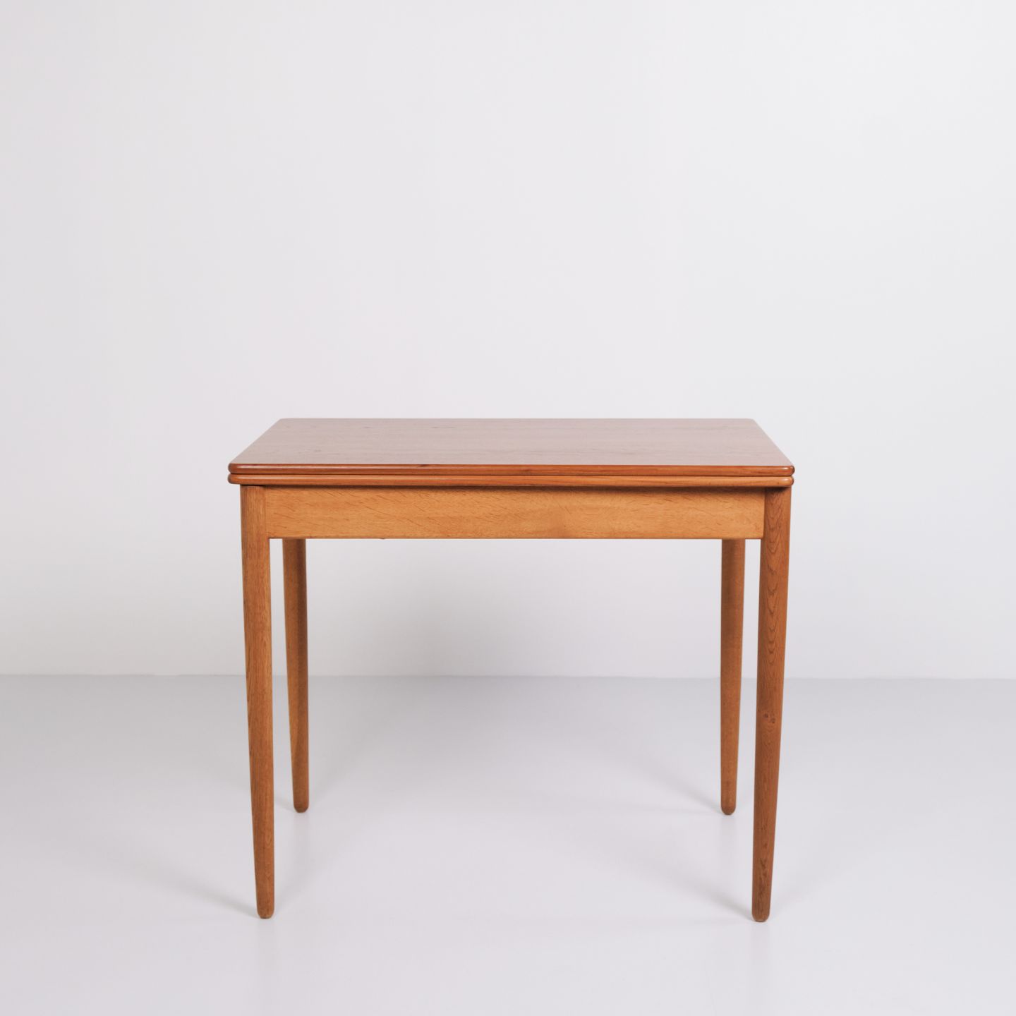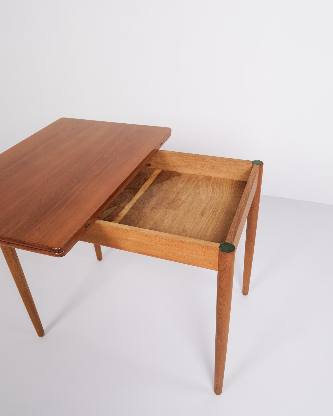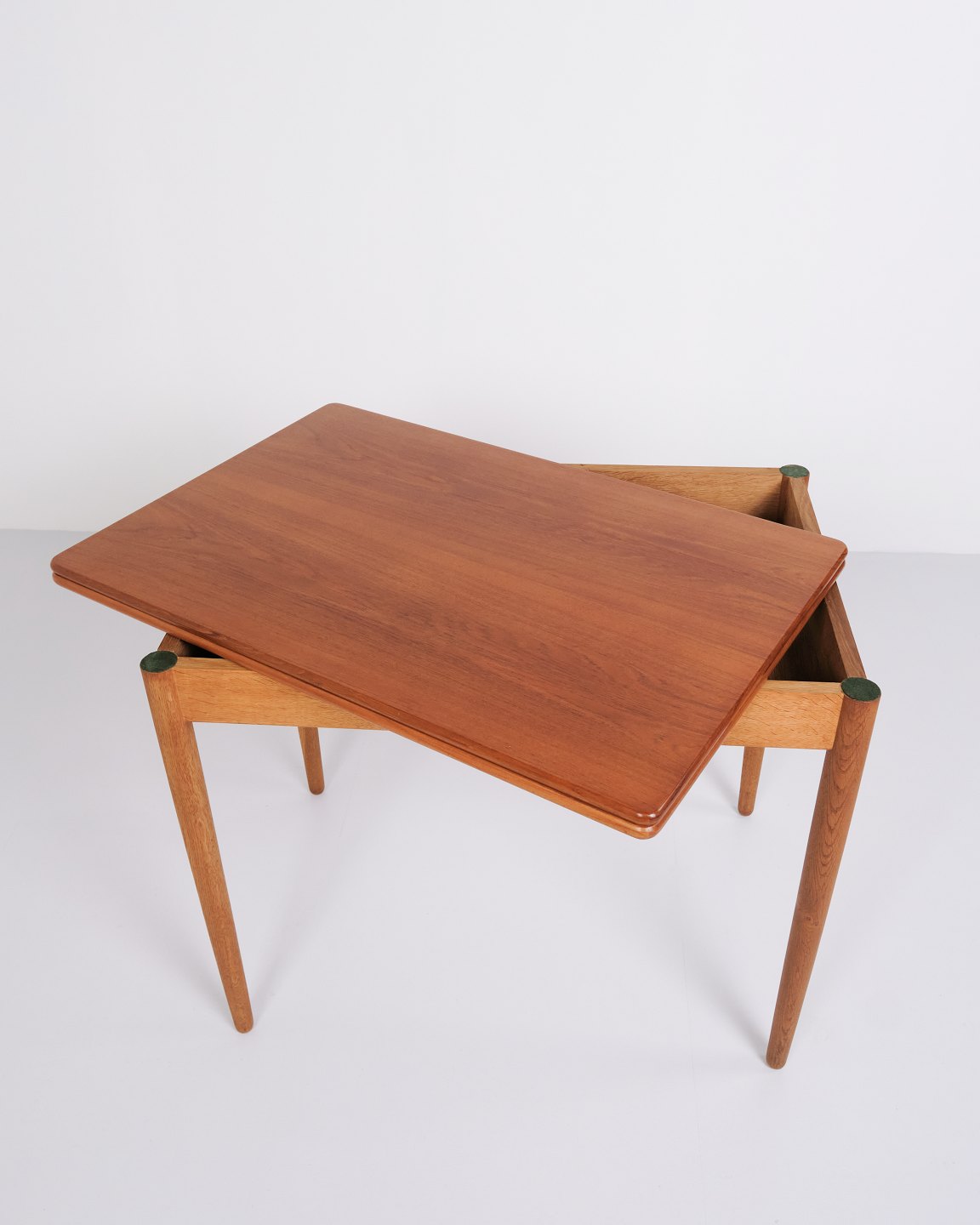 Hans J. Wegner spise/spillebord for Andreas Tuck. Teak og eg, 1960’erne. Indbygget opbevaring.