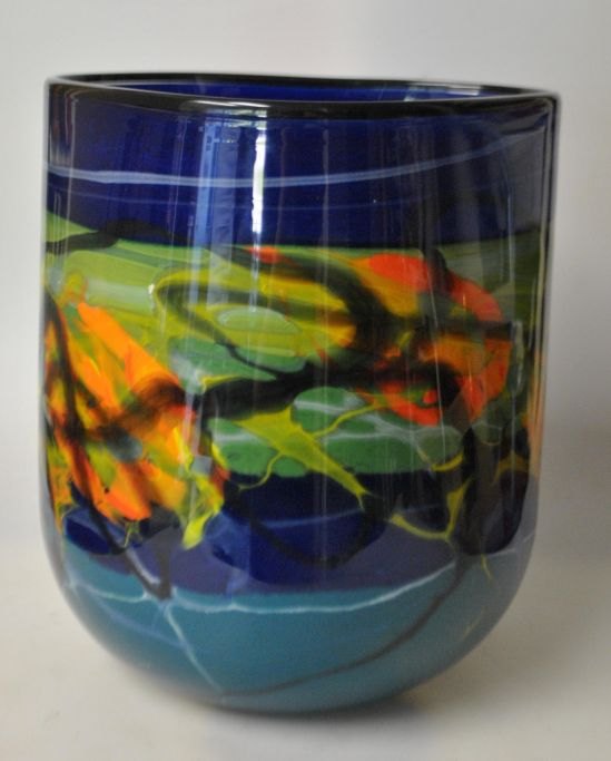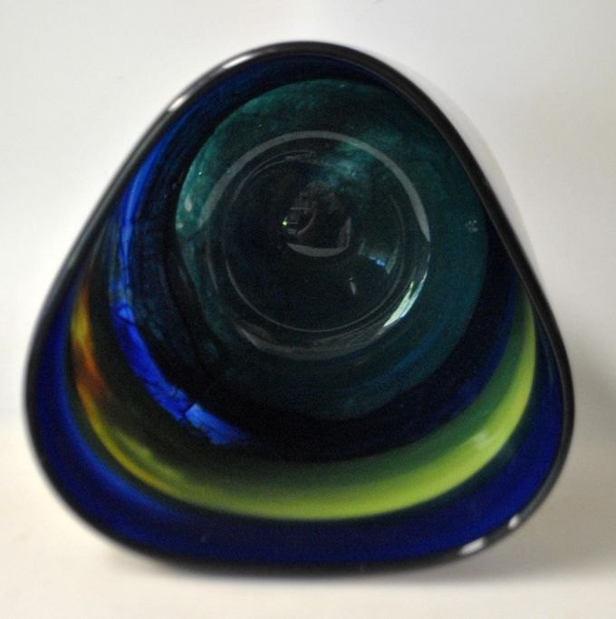 Nemtoi, Ioan (1964 - ) Rumænien: Glasvase i trekantet form. Glas i blå og grøn med gule, orange og sorte svirvler. Signeret. H: 21,5 cm. B: 19 cm.
