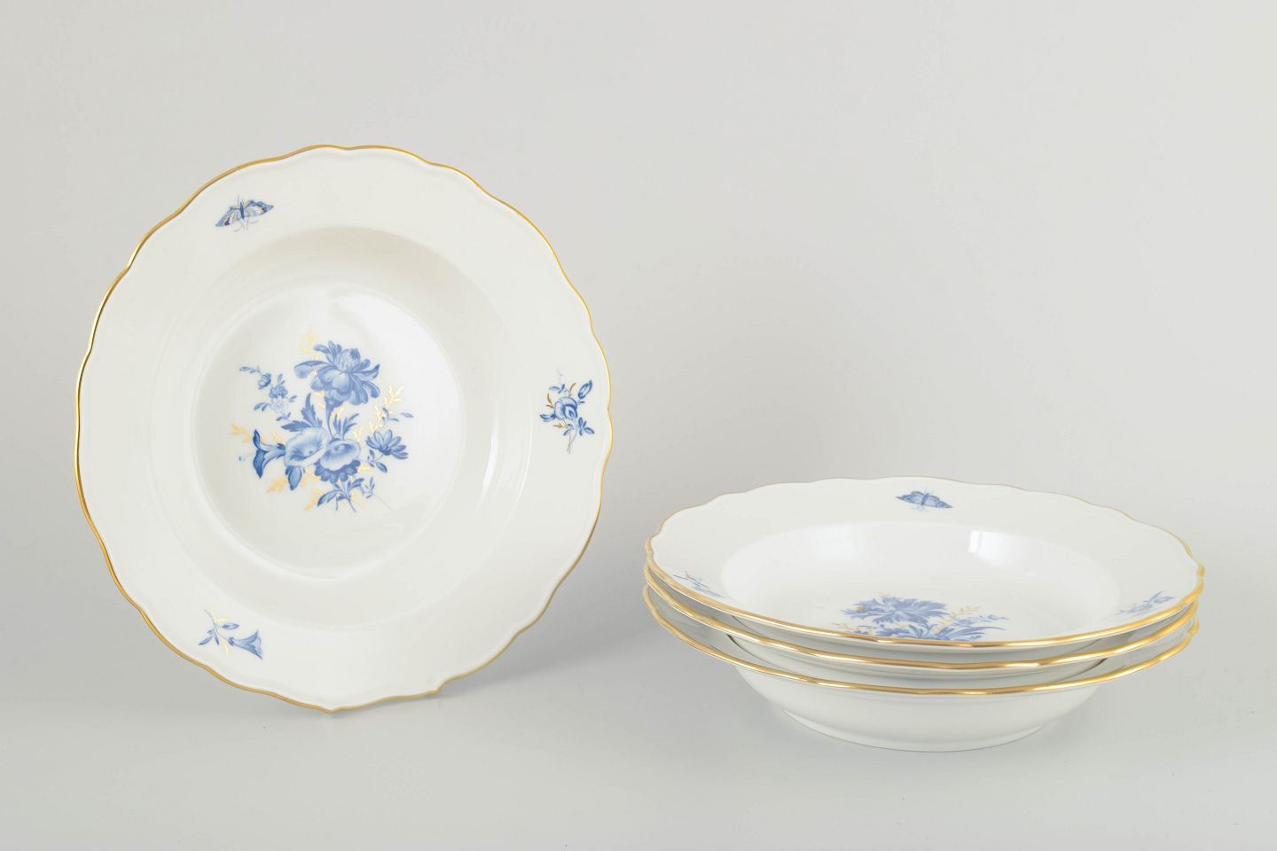 Hånddekoreret porcelæn med håndmalet blå blomsterdekoration og forgyldte stafferinger langs kanten. Klassisk bølget form.