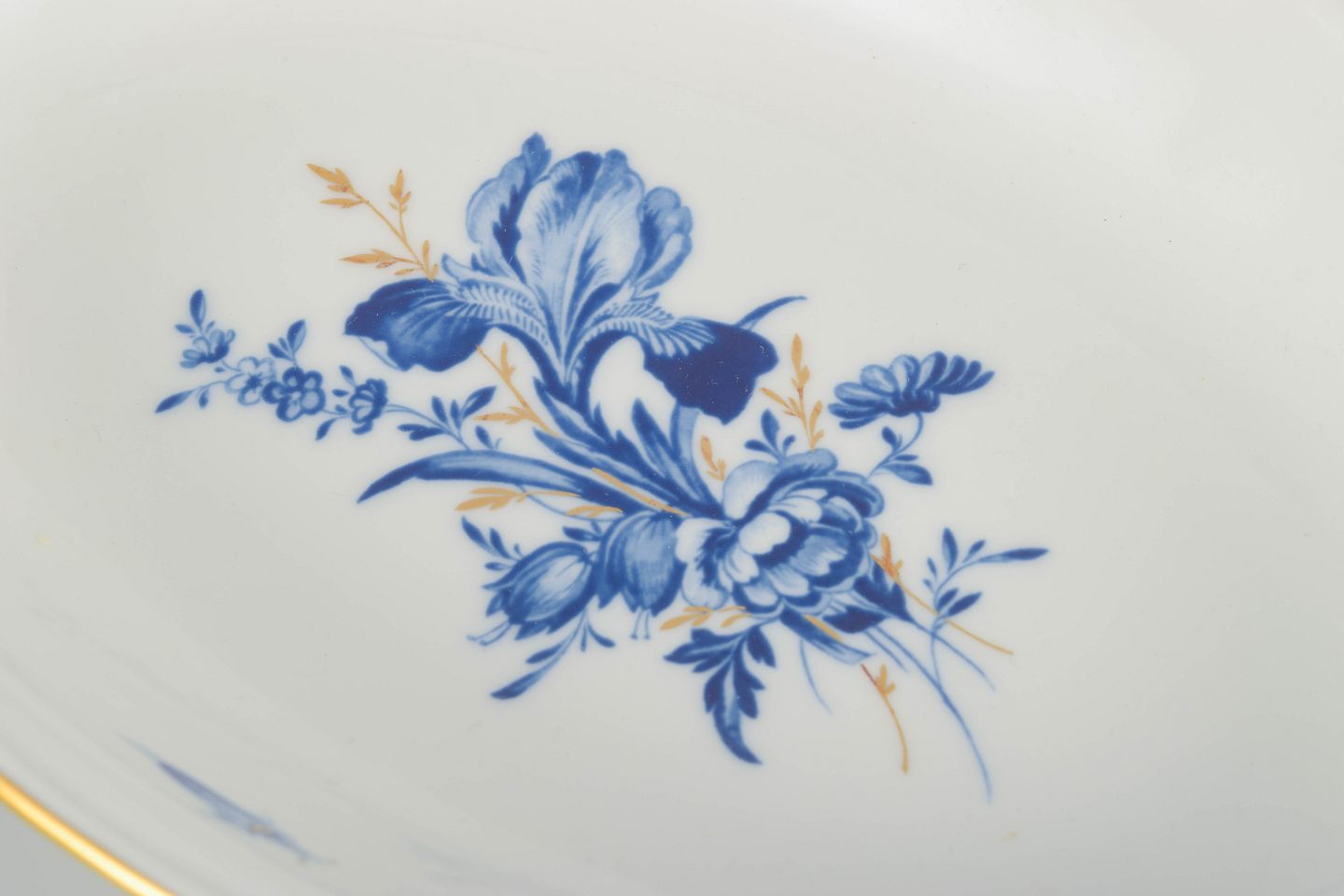 Hånddekoreret porcelæn med håndmalede blå blomsterdekorationer og forgyldt staffering langs kanten. Klassisk elegant Meissen-form med let bølget rand.