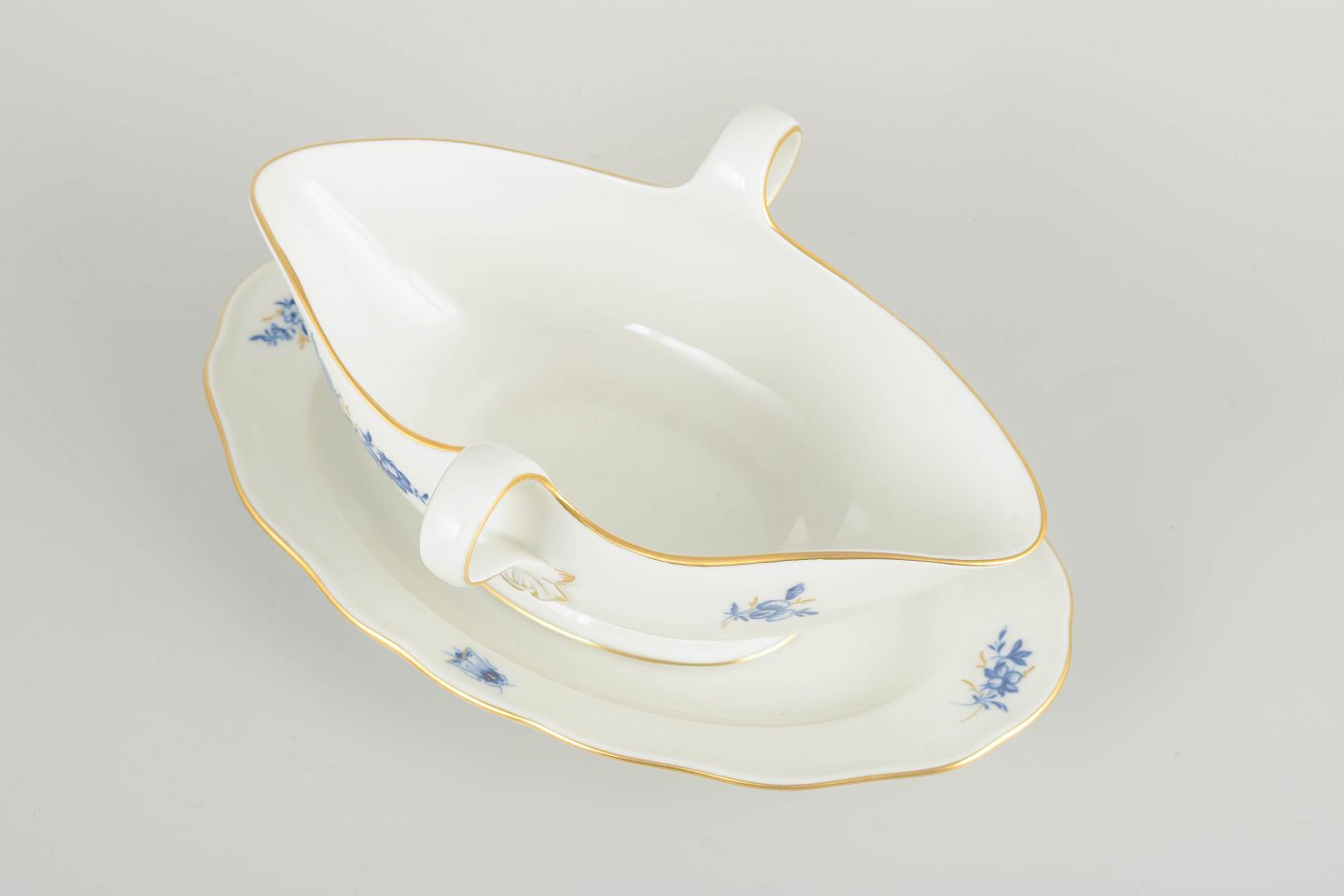 Hånddekoreret porcelæn med håndmalede blå blomsterdekorationer og forgyldte stafferinger langs kanter og hank. Elegant asymmetrisk form med dobbelt hank.
