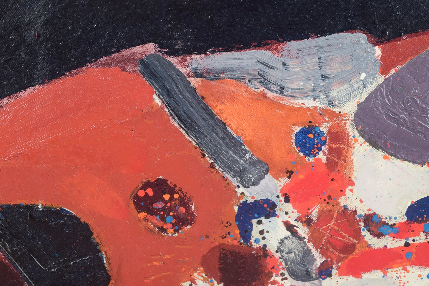 Et ekspressivt abstrakt værk i cirkulært format, hvor røde, sorte og blå farvefelter mødes i en dramatisk og næsten kosmisk komposition. Spor af paletkniv og gestiske strøg skaber et intenst, natligt stemningsrum – som et imaginært landskab set i mørket.
