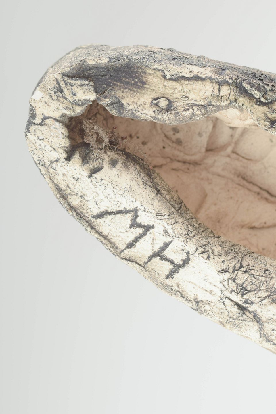 Unik, håndmodelleret skulptur i stentøj med rå overflade i gråtoner, dekoreret med blå glasurbånd og hvide hornlignende former. Et ekspressivt og figurativt værk med stærk personlig karakter.
