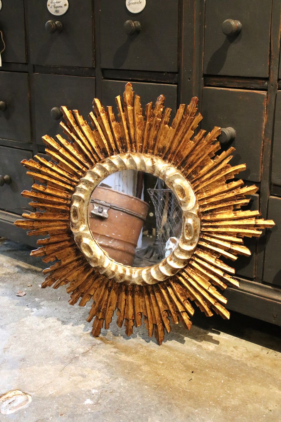 Fint , gammelt sol spejl i forgyldt / forsølvet træ med originalt gammelt spejlglas og en rigtig fin patina. Dia.: 66cm. Spejl Dia.: 24cm.