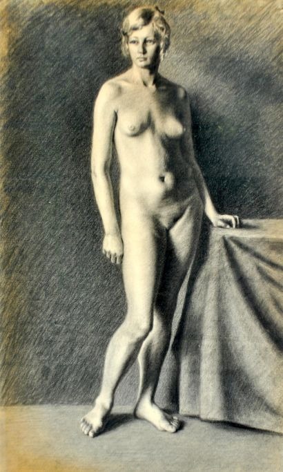 Dansk kunstner 20. årh.: En ung kvindelig model. Tegning på papir. Usigneret. 80 x 49 cm.