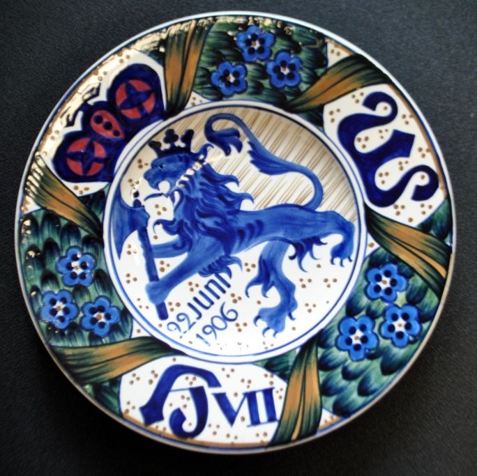 Aluminia fajance 481/352 Platte. Danmark. Dronning Maud og Kong Haakons d. 7.s Kroningsplatte 1906.