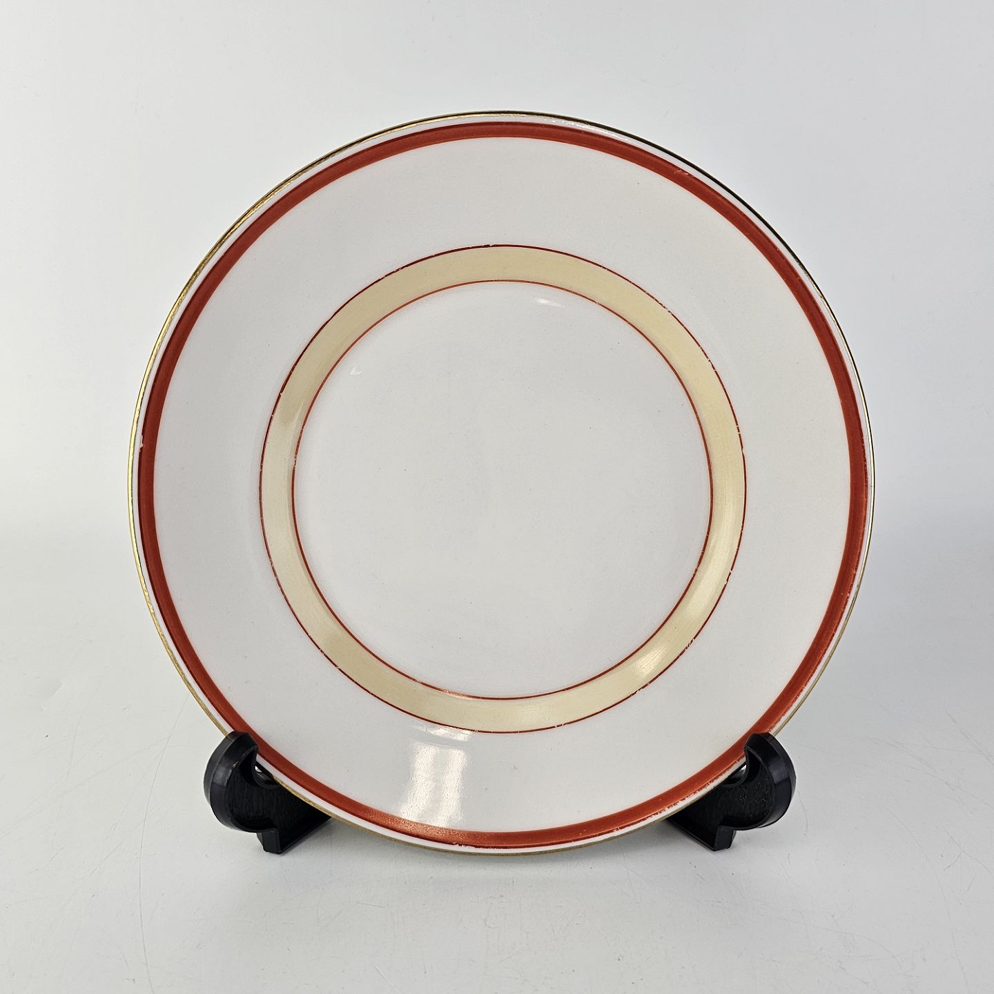 Service i glat hvidt porcelæn pyntet med dekoration i beige, brændt orange og gylden streg.