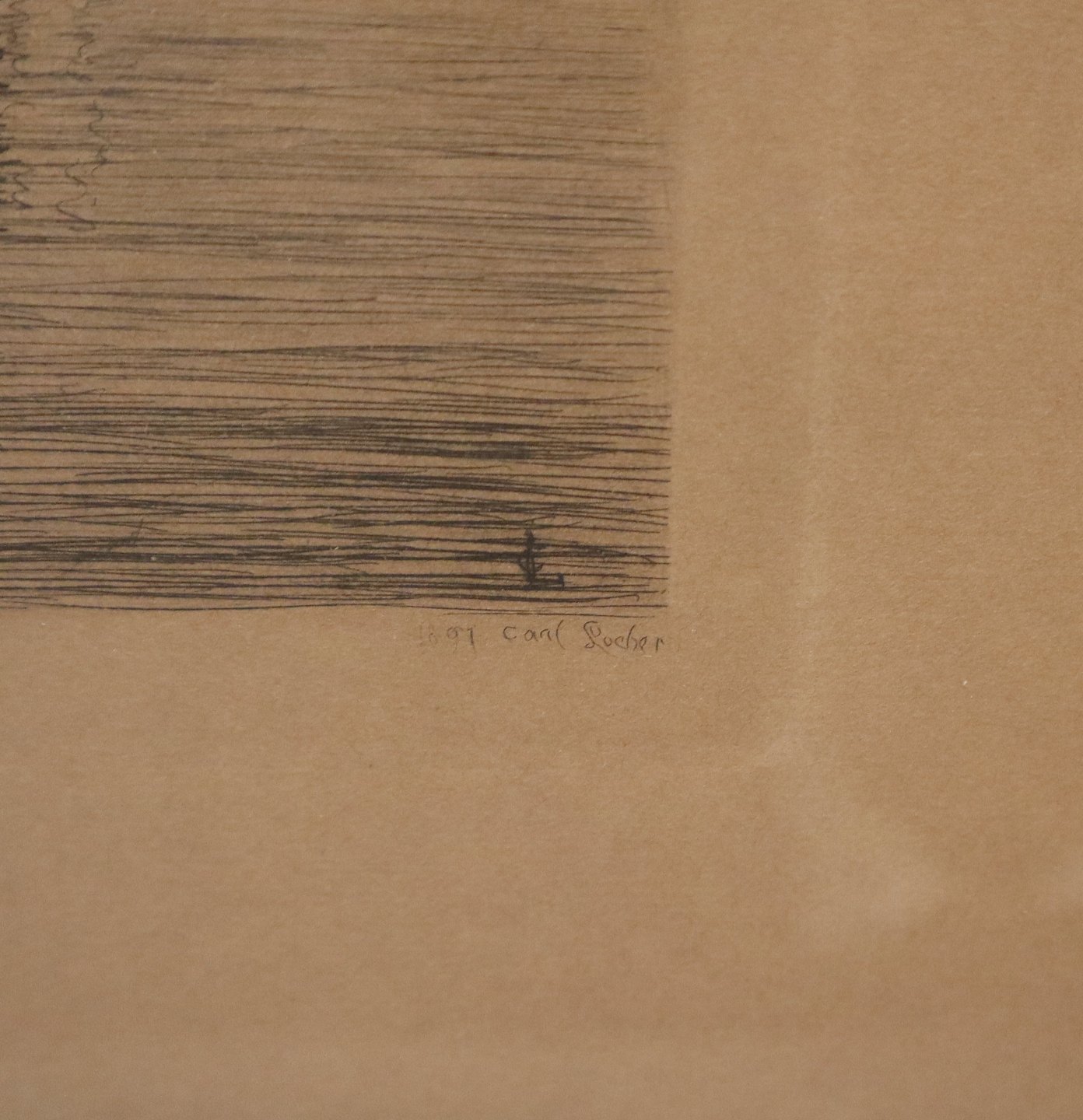Radering: Carl Locher 1907 Marine motiv med sejlskibe 45 x 41 cm inklusiv originalt glas og guldramme