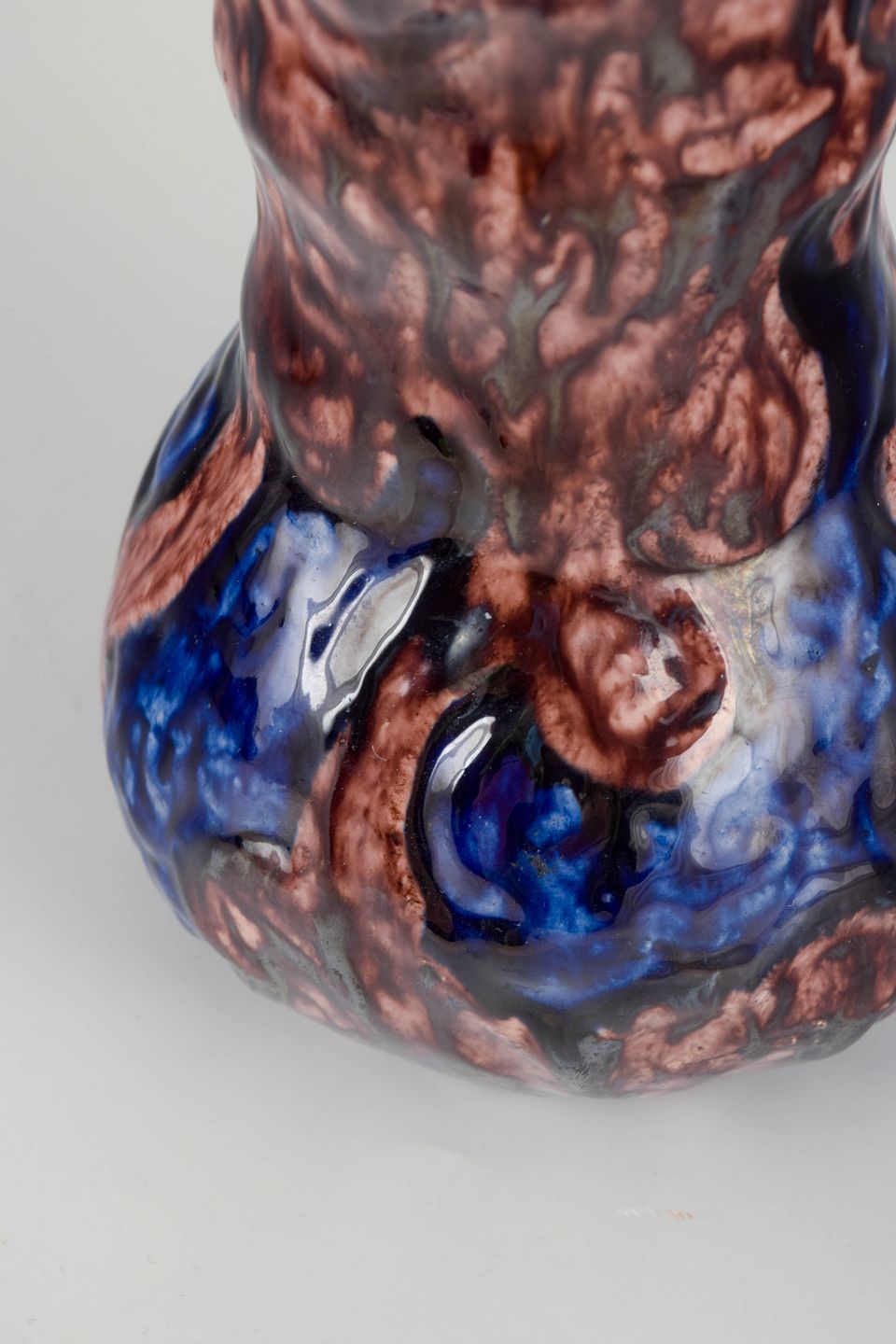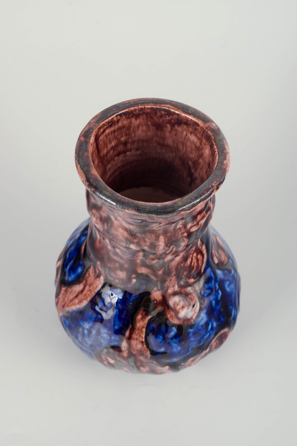 Håndformet stentøjsvase med blød buet krop og levende flammet glasur i dyb brun med flydende blå top og lodrette penselstrøg i jugendpræget udtryk. Unikt håndlavet værk.