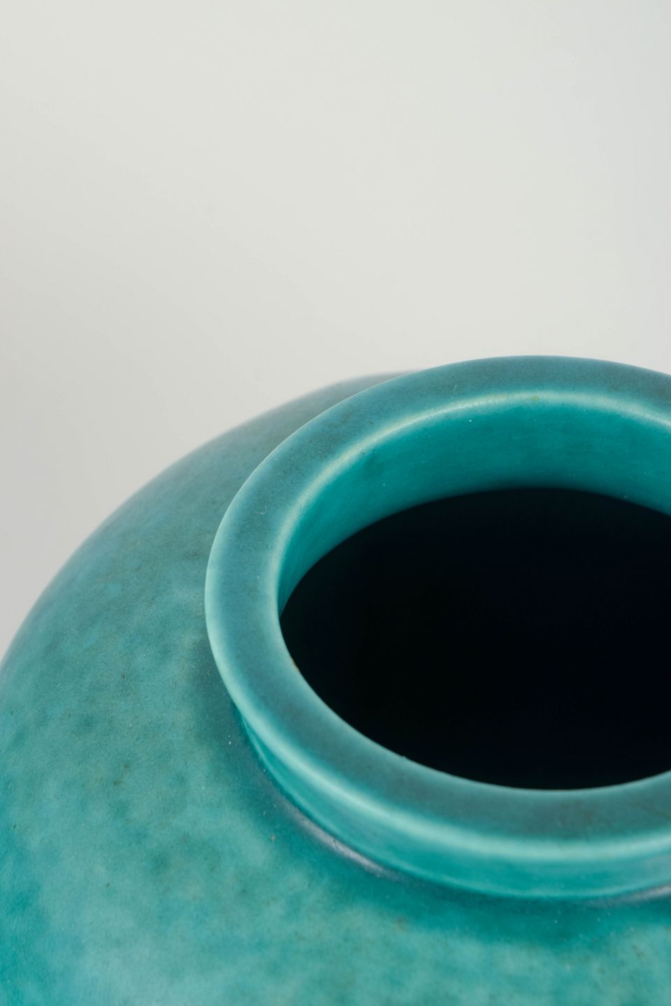 Ustemplet vase i blødt afrundet cylindrisk form med let indtrukket hals og dyb turkis glasur med levende farvespil – typisk for Kåges Azur/Tonan-serie. Elegant og harmonisk art deco-udtryk.