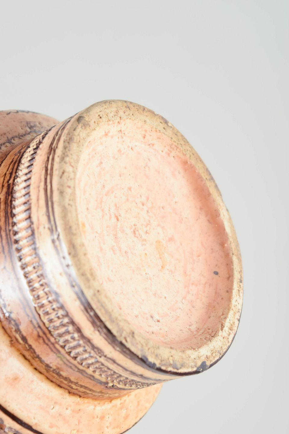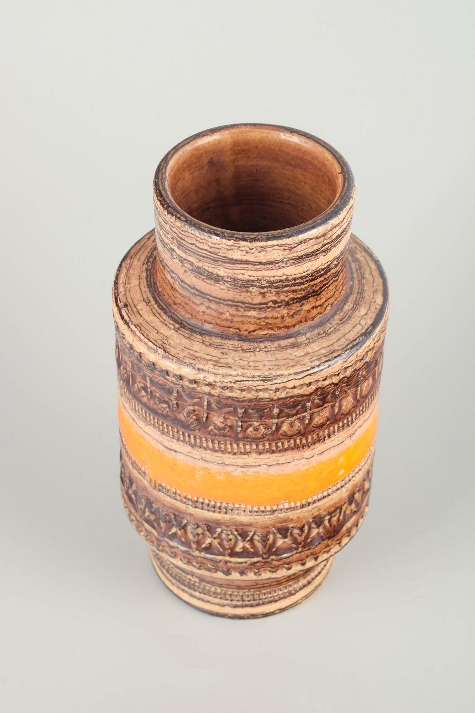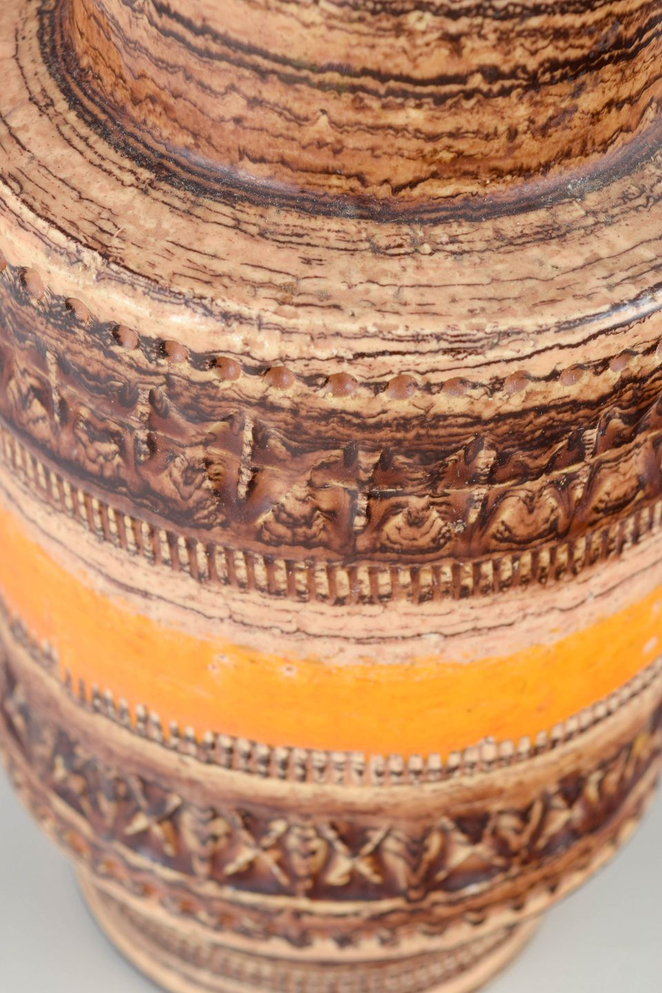 Cylindrisk stentøjsvase med karakteristiske indgraverede bånd og varm orange-brun glasur i relief.