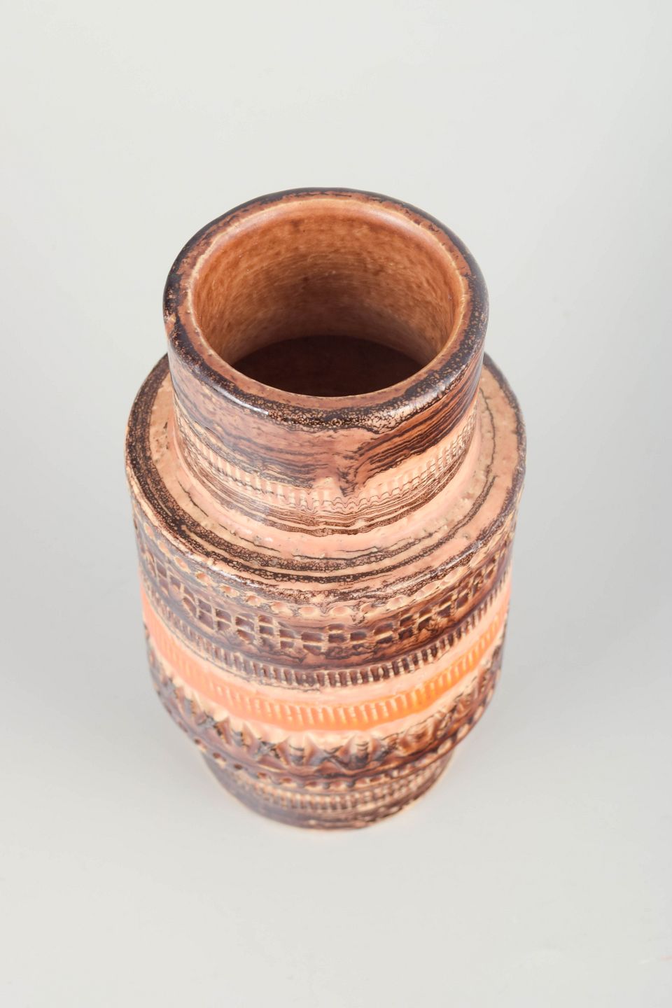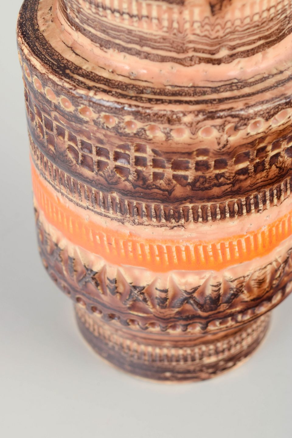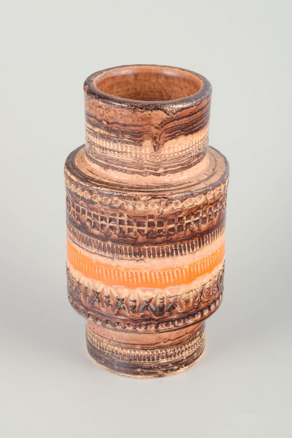 Cylindrisk stentøjsvase med karakteristiske indgraverede bånd og varm orange-brun glasur i relief.