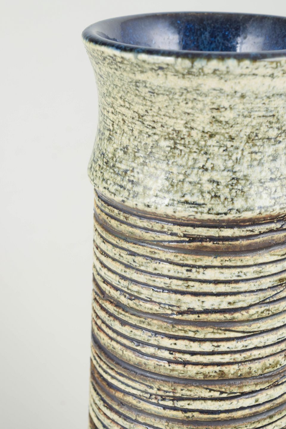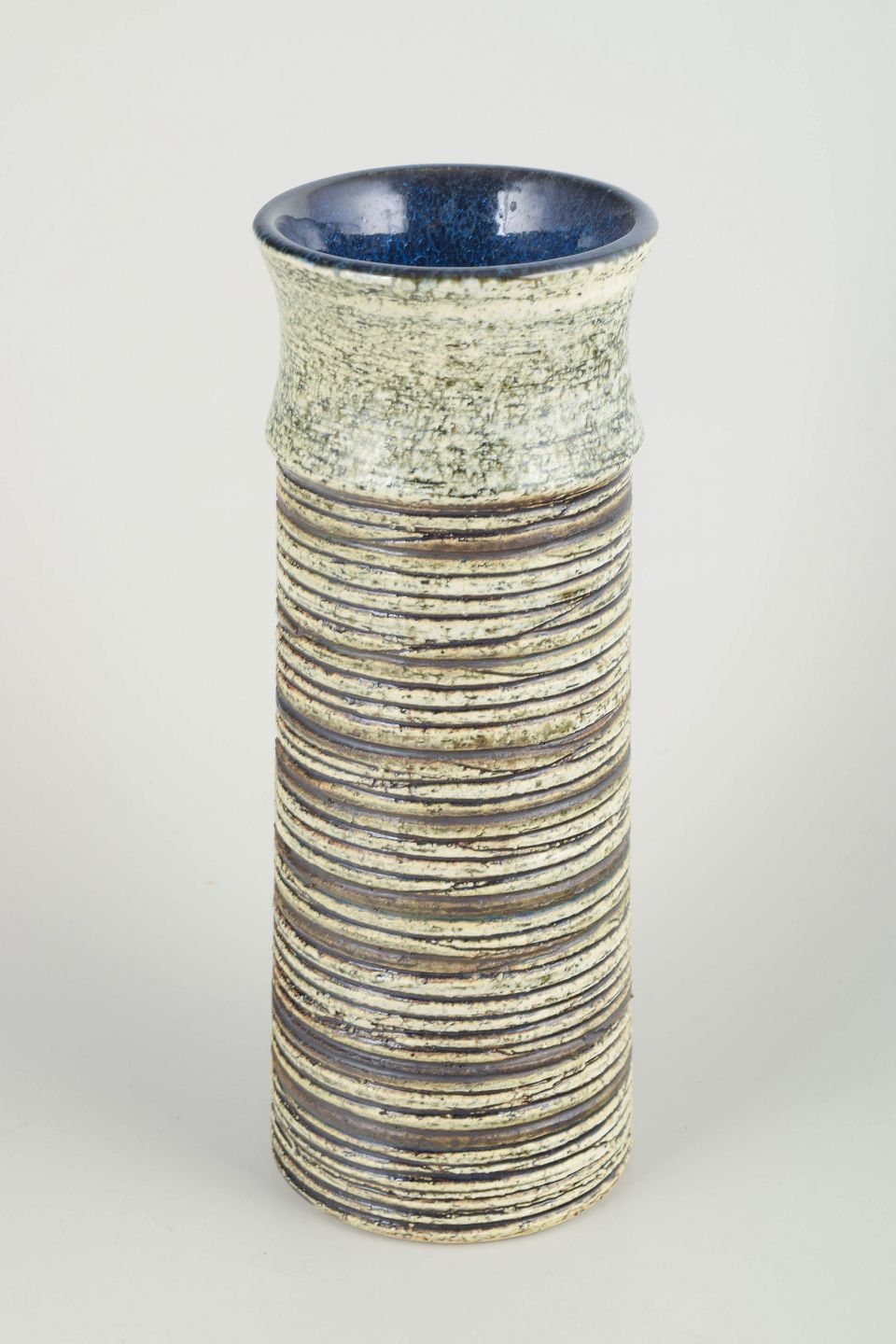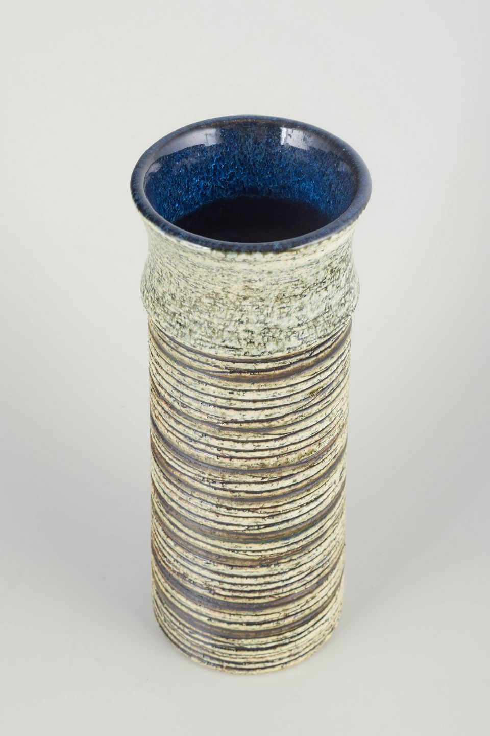 Cylindrisk form med hånddrejet horisontal reliefstruktur og mørk glasering indvendigt. Signeret “BS” under bunden.